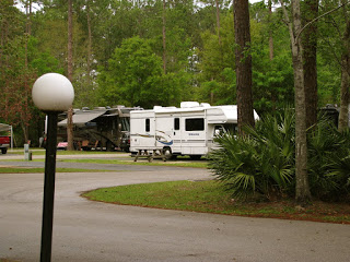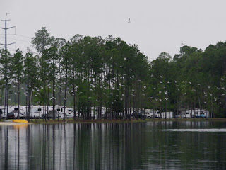 But what a pretty campsite, I just had to post some pictures. It’s huge, with a lake in the middle with a water-spout and a wonderful flock of white birds soaring around. Had dinner at the on-site cafe – bar-b-cue ribs, slaw, fries and a local brew for $10. A whole group of RVers from The Villages are here and reminded me of why Carrie and Don and I hated this place so much last year when we spent 4 days there. Rude, loud and obnoxious. While standing in line to order dinner, some man just stepped in front of me, demanded a beer, and didn’t once apologize or even ask. And people wonder why I travel alone?