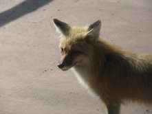 The weather forecast was for a high in the mid-80’s, but at 7 a.m. on the back of a cycle, it was damn chilly. I had on a helmet, sweatshirt, jeans and a leather jacket but I had forgotten gloves and my fingers were freezing! We sped down the road, heading 25 miles toward the Park, and suddenly had to slow down to almost nothing to dodge 5 BIG buffalo slowly strolling down the middle of the highway! Wildlife is everywhere you look. While we were eating I looked up and there was this beautiful red fox peering in the window. She was hoping for a bite to eat and was very happy to just stand there and let me take pictures.