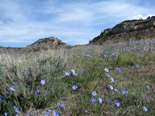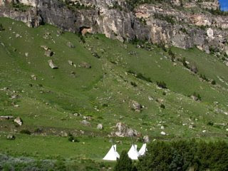 I was pleasantly surprised to find 3 Indian teepee’s set-up along side the river, in the shadow of the mountains. I think they must be ‘real’ and used in tribal ceremonies during the summer months. And the wildflowers were blooming all along the roadside – bright blue-bells giving color to the vast grasslands which flank each side of the road-way.