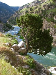 Jut south of Thermopolis, when driving up to Cody, one must drive through the Wind River Canyon. It’s Arapahoe land and it’s just beautiful. Because I was driving Winnine and towing Willy, I didn’t take time to pull off and take pictures. But this morning I took the time (several hours, in fact) to drive south and then back north through the canyon, stopping and taking as many pictures as I wanted! The land here has ‘greened’ since I arrived, and the rather dull browns and reds have given away to every shade of green – from the gray-green of the tumble weed to the green grasses to the dark greens of the pines which cover the mountains. The river are flowing fast and furious with all the snow-run-offs. The white-river rafting companies are back in business and the fishermen are waiting for the the waters to settle down.
