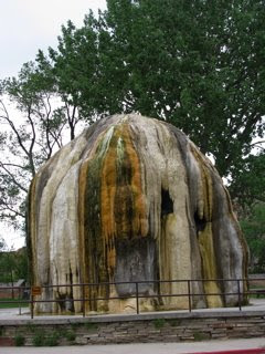 Sulfur does not smell nice – it smells just like rotten eggs! – and this smell permeates most of the town. But we had fun exploring the state park, which is home for lots of buffalo, several ‘plunge parks’ where you can rent towels and even bathing suits and either sit in or fly down shuts into the very warm, stinky waters. The picture is of the TeePee Fountain which was started in 1903 has continuously poured out it’s mineral waters while the minerals have solidified around it.