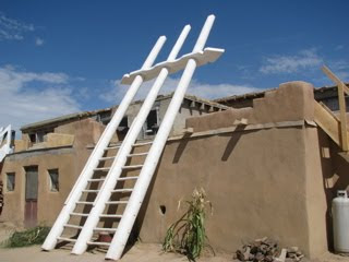 From the visitor’s center, a mini-coach took us up the mesa’s side. Our walking tour of the site was led by a member of the tribe. A gentle man whose love of his ancestral home, his family, his Tewa-speaking neighbors, his religion and the history of his people he wore as a spiritual cloak that virtually glowed like an aura around him. He shared much about the pueblo, including showing us the many sacred kivas — or places of ceremonies, learning and worship — throughout the site. This picture shows just one of the kivas with a spectacular ladder providing access to the ceiling entrance. We were told that the ladder’s vertical poles symbolically point toward the heavens and the arrow at the top provides protection. To this day, only men of the tribe are allowed in kivas. And while our guide also shared that only men serve on the governing council, he also said that they live in a matriarchal culture where women own all the land and possessions and control much else of the tribe including lineage. Very interesting balance that has served the culture beautifully for hundreds and hundreds of years. In fact, the pueblo has been continually inhabited for at least a thousand years. Those who live there today do so without running water, electricity or indoor plumbing. Their motivations are different. Some elders, because it’s the only life they know. Some male tribe members because it is their responsibility to serve a period taking care of the ancient city. As our tour wound down, the guide showed us his family’s ceremonial home and invited us back to join them for a huge festival to be held the following Wednesday. Music. Dancing. And tons of food. Very sorry we couldn’t make it. I’m quite certain his invitation was genuine.