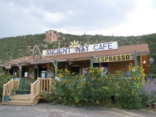 After that, we headed out to one last sight even further west. We had begun to rely on our trusty Frommer’s guide on New Mexico and called to see if there were any chance that the specially noted roadside restaurant was — contrary to published details — open on Sunday. Yeah! It was. Happily, when we were only a mile from our last site of the day, we stopped for a very late lunch at The Ancient Way Cafe. What fun. Sat on the porch and enjoyed freshly made Chicken Pesto. Chatted with the Native American waitress…and then, the chef. A most interesting fellow. Former potter. But someone who definitely never wanted to work for “the man”. At dessert time, we wanted to try their famous Berry Cobbler with Green Chili…but, alas, it was sold out for the day. Just HAD to suffer through the blackberry cobbler with ice cream. Sugar is a great re-energizer. So, off we went with only an hour before the gates closed on our next and final stop for the day.