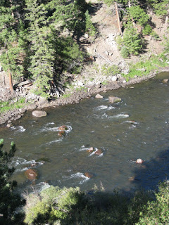 Here it’s rocks! And rapids! And a completely new type of kayak. The Rio Grande is still quite chilly, even in late autumn, because it’s filled with snow melt from those large mountains that feed it. And there are the biggest rocks sitting right in the middle you have to maneuver around – which isn’t always possible. I took this picture from the top of the gorge looking down just to give you an idea of the rocks – which I became personally acquainted with!