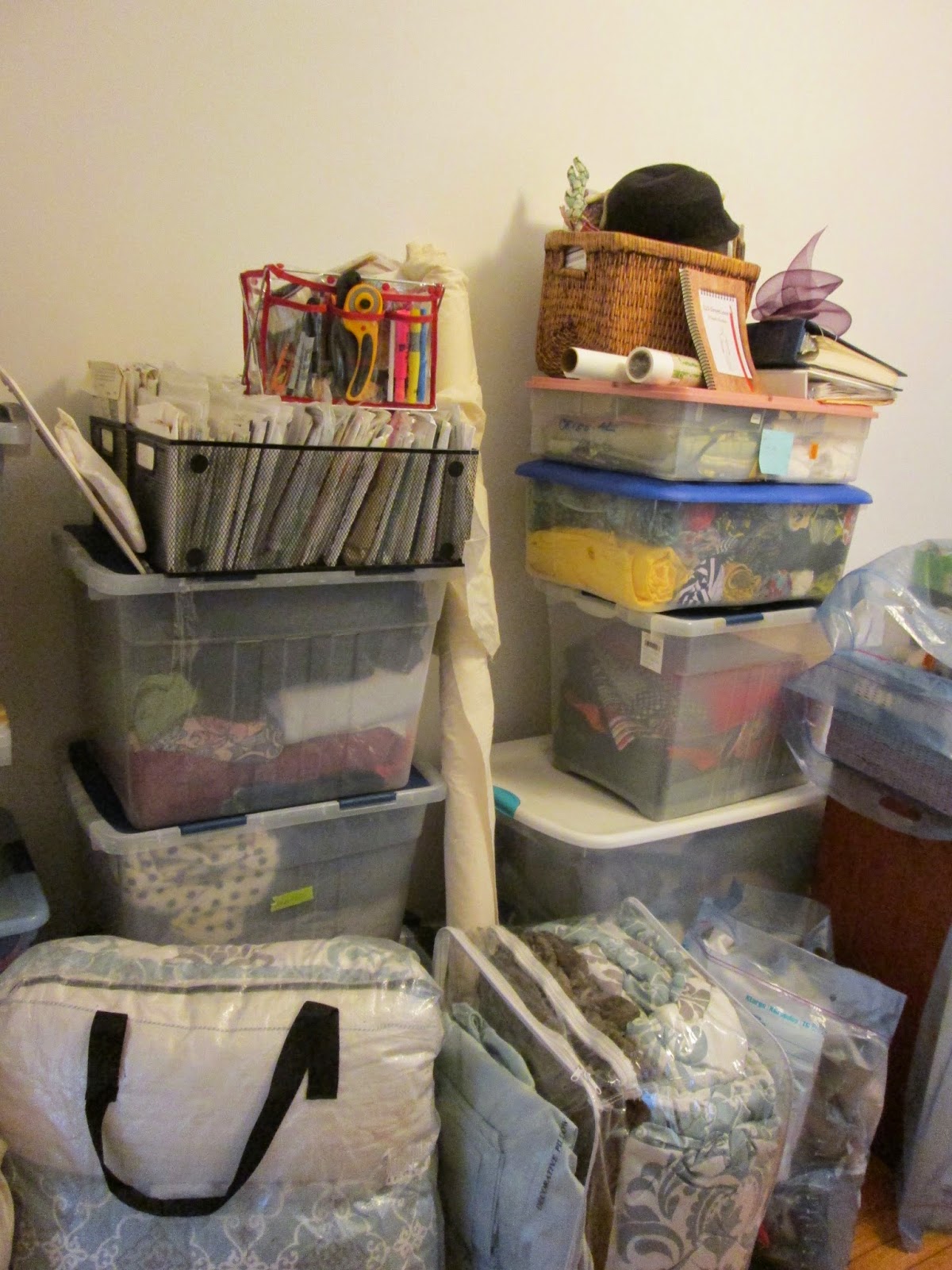 Of course, I’m always amazed that my collection, or fabric stash is always so much larger than what I think it is. I took the time to go through every single piece, ‘rolling’ instead of folding the most-loved pieces back into their storage boxes. I actually winnowed 3 full sacks to give to my favorite charity, Envision, but I still have 8 boxes of fabric and at least 2 more of patterns and notions.