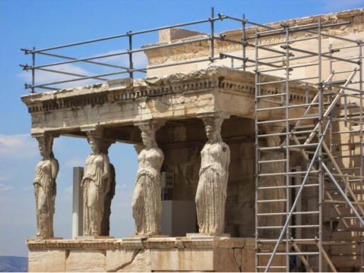 Here the very, very old (10,000 BC) is still standing right next to a brand new high rise apartment.  To wake each morning an have a of the Acropolis and Parthenon is just mind-blowing!  As you can see, the never-ending task of keeping these ancient monuments upright is a on-going process – therefore the many large cranes and scaffolding.
