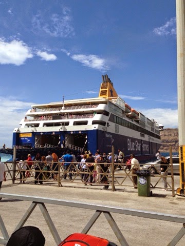 From Athens I took the dreaded metro at 6 a.m. to catch the Blue Star Ferry from Piraeus to Santorini. It’s a 9 hours ride and I must admit, though dreading it, it was really lovely! The boat/ship is very up-to-date and has all the amenities you could want. I took over a lovely, big couch, pulled out my Cubs blanket and blow-up pillow and went to sleep for a few hours. Upon awaking, I ate my lunch (which I had purchased on shore after hearing how high the food prices were on the boat) and played on my computer and read for the next 6-7 hours, arriving on Santorini at 3:30 p.m.