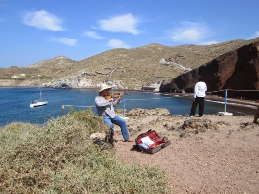 Walkable also was the beaches of Black (big black stones, no sand – Ouch!) White Beach (missed that one) and Red Beach – the most popular one on the island – but a what a climb up and over just to get there! I loved this little guy playing the violin at the the top of the climb before the decent to the beach.