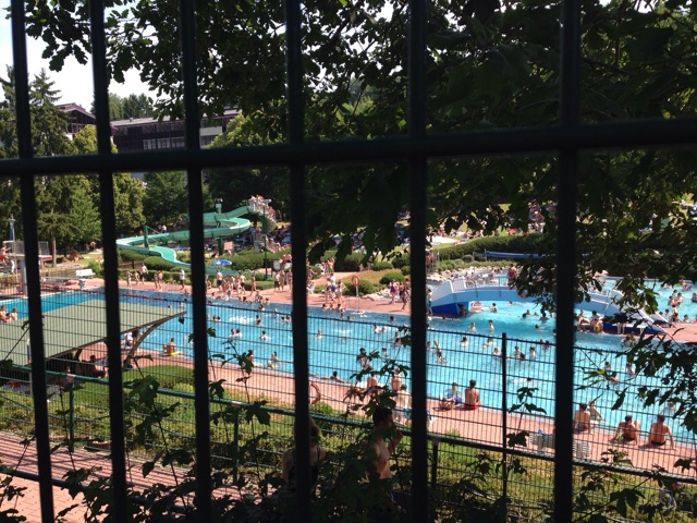 This photo was taken as we were getting ready to enter and it shows only about 1/2 of the complex. German’s don’t believe in heating pool water, so on a day with when the air temp is 100º, the pool was a wonderful 76º!!! Too many people to swim laps, so we just stood in water up to our shoulders for about 3 hours and let our body temps cool down.