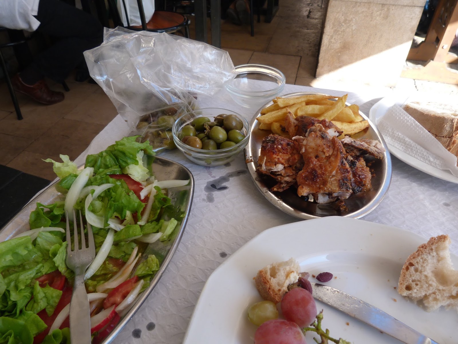 I wish I had a better photo. Here was my lunch – a delicious salad of fresh lettuce, onion and tomatoes. A bowl of olives, grapes, pâté and fresh baked bread to nibble on while I sipped a carafe of red wine (not shown) until my dinner of a 1/4 of roasted chicken (absolutely delicious) and chips arrived. The cost of this very normal lunch – €7.00 – just $7.53!!