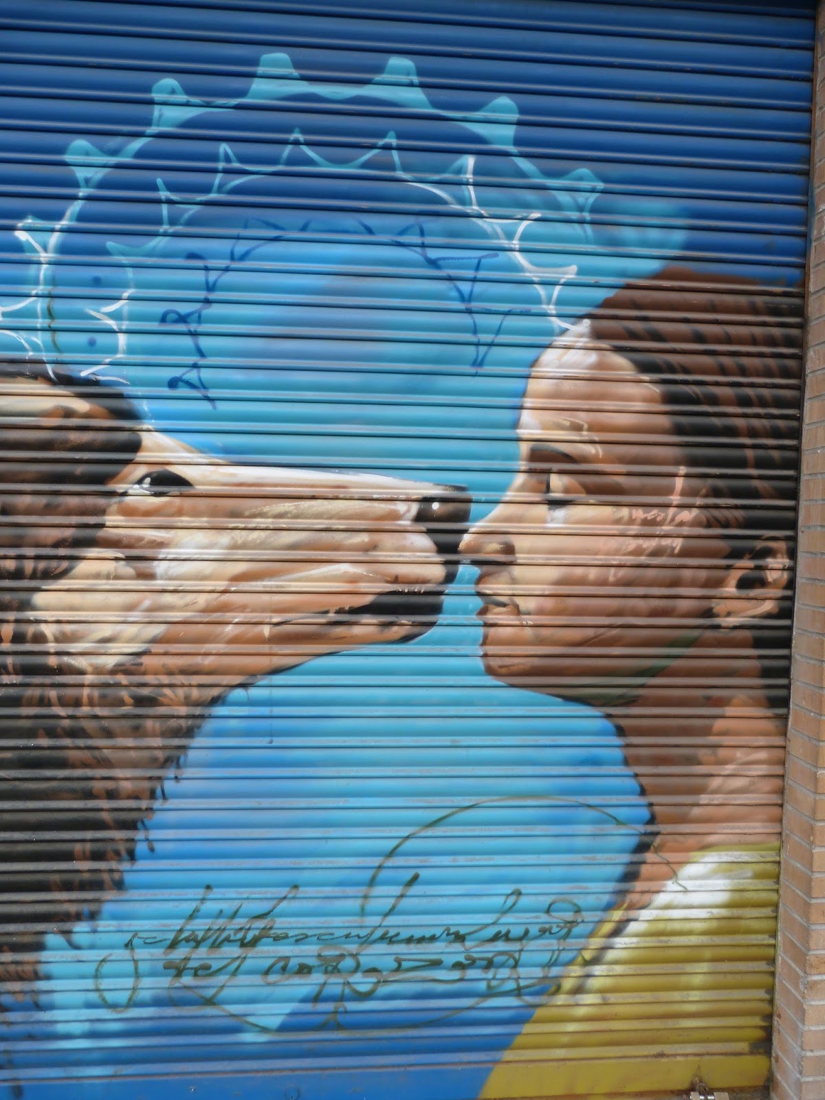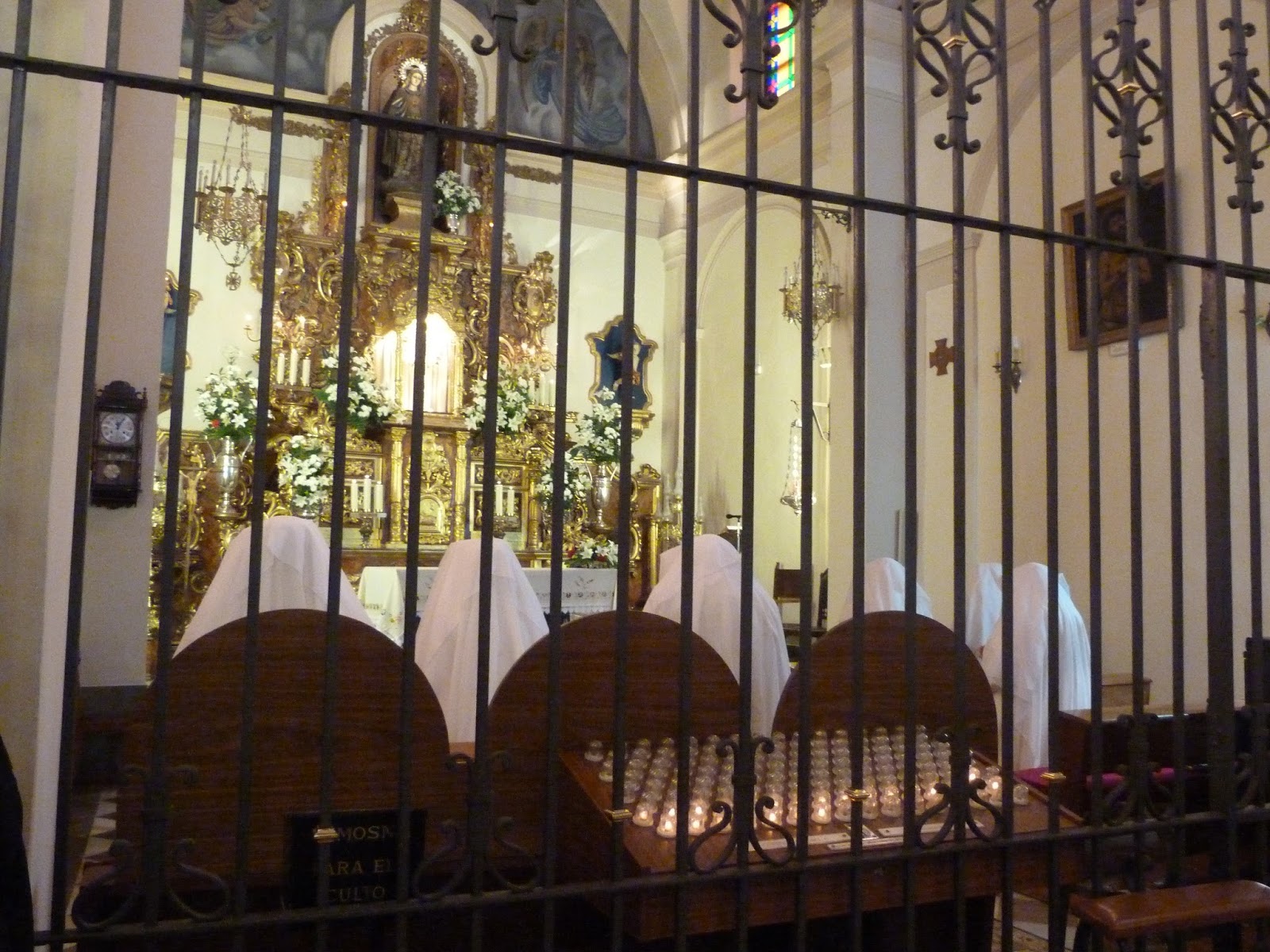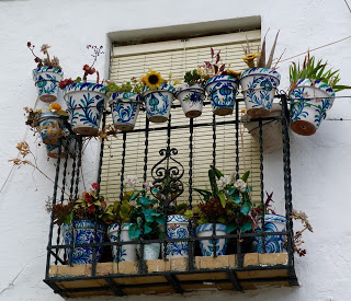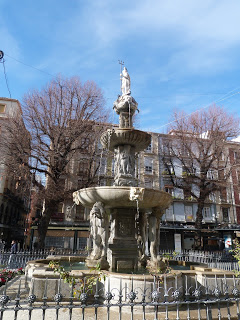 Following are just a few of the many photos I took this chilly but sunny day of the wondrous architecture we saw – including the massive Cathedral of Granada – which was built over the Nasrid Great Mosque of Granada. We entered a small church with it’s cloistered nuns sounding like angels singing while the sun shone through the stained glass illuminating the walls in a rainbow of colors; climbed twisted narrow streets with colorful flower boxes hanging on each window; strolled through the large, tiled squares filled with restaurants and people of all ages; enjoyed the fabulous street art; plus stopped at a small coffee cafe for a choice of very strong coffee or a glass of wine served with slices of fresh bread and olives. Yum!