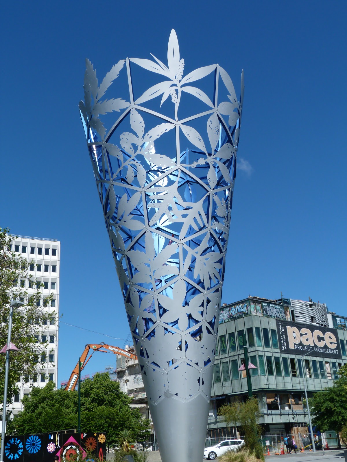Lastly – my favorite piece of art that graces the center of town, in the middle of Cathedral Square is a beautiful chalice-like metal piece that symbolizes hope – which this city certainly can use.