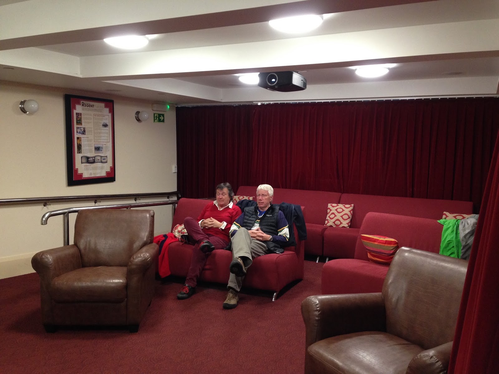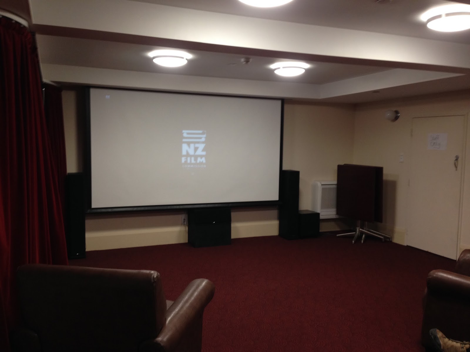 The dinner was delicious and as I said, the movie was hysterical but I can’t not show you photos of the actual theater.  I watched it with a couple visiting from Wellington who had seen it 5 times.  I sat across from them on the comfy couch with pillows for my back and a nice foot rest for my feet.  We were the only ones in the ‘theater!’  You can see the big red curtain on the left that the woman who was selling tickets and making popcorn pulled closed in lieu of a door.  It took me a long time to stop laughing.