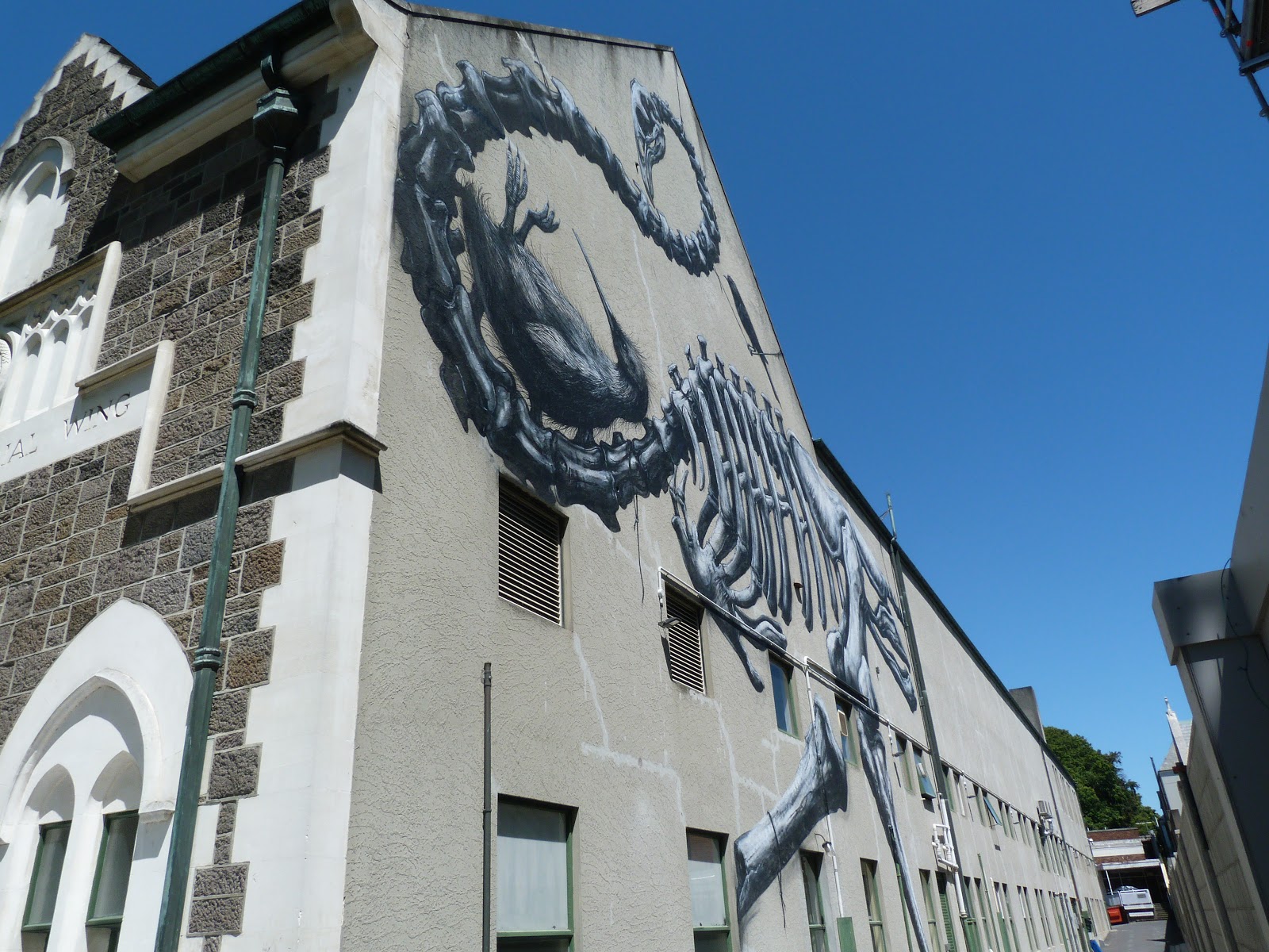 Christchurch has tried to brighten is walls with interesting street art – hoping people don’t realize you are only seeing the wall – and not the building it used to be part of.