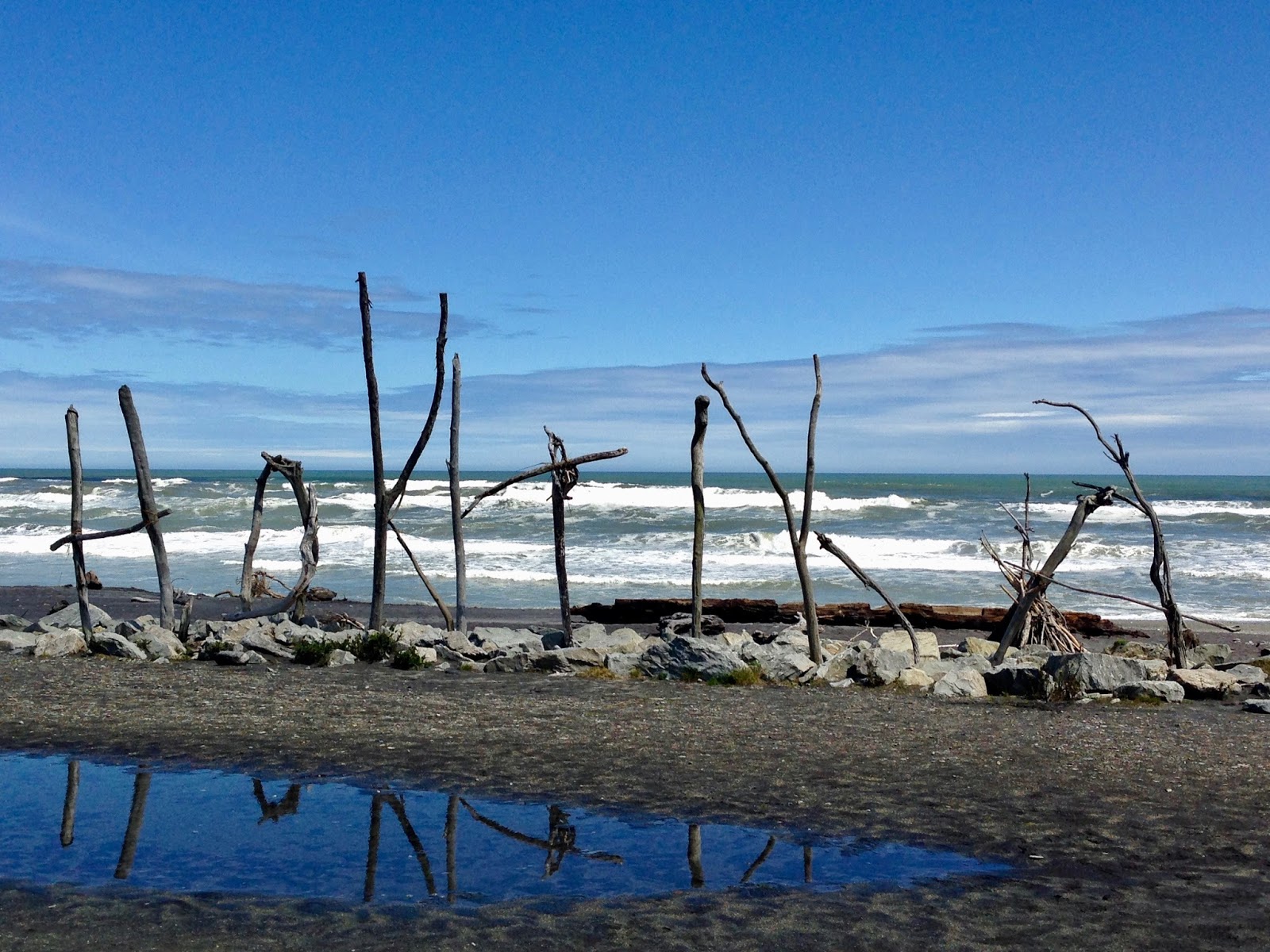 A Hokitika sign is always on the beach made from driftwood which is all over the place