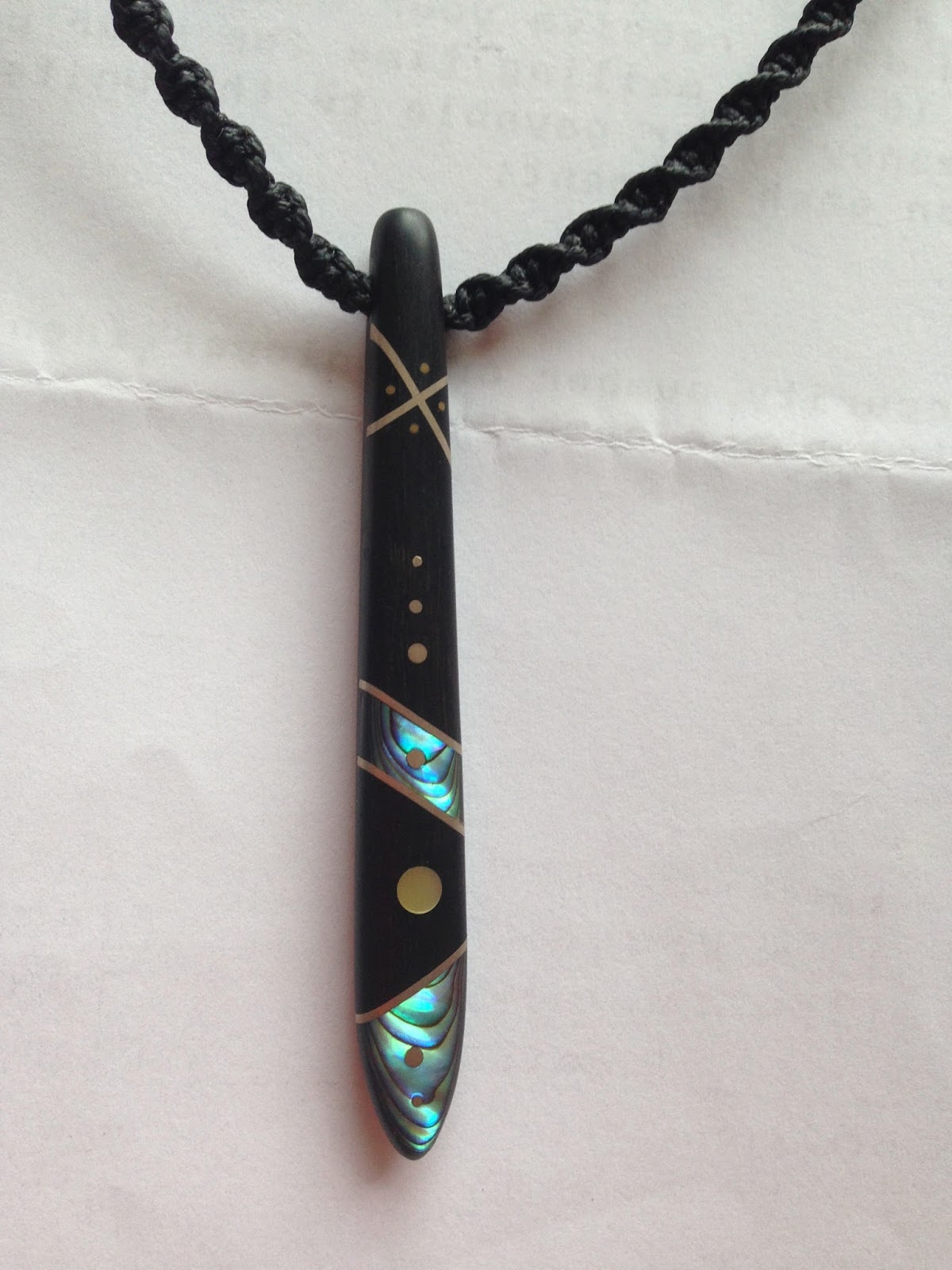 Oh, you are wondering just what I bought instead of greenstone?  It’s a piece by artist Yannis Petzold of Raglan, NZ.  He learned his carving skills from his father and combines antique ebony piano keys with silver, brass, paua shell and mother-of-pearl to make one-of-a-kind pieces of stunning jewelry.  He also hand-weaves the leather ‘chains’ that hold the piece.  It may not be greenstone, but it’s me!