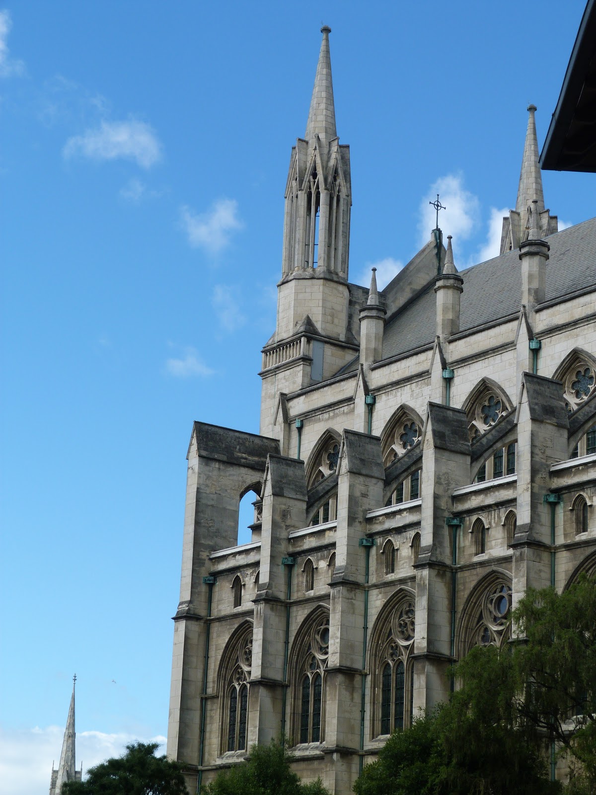 Above is a side-view of the Cathedral and my favorite window I found in a small nave inside – honoring the areas seals, penguins, and albatross!