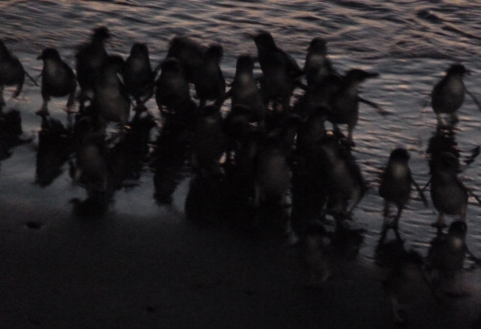 After a enjoying a beautiful sunset over the inlet, we were treated to a very nice fish ‘n chips dinner in the Center’s cafe while we waiting for darkness to fall – the time when the little penguins return from their day in the sea and come onshore to spend the night in their nests built among the rocks.