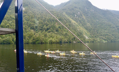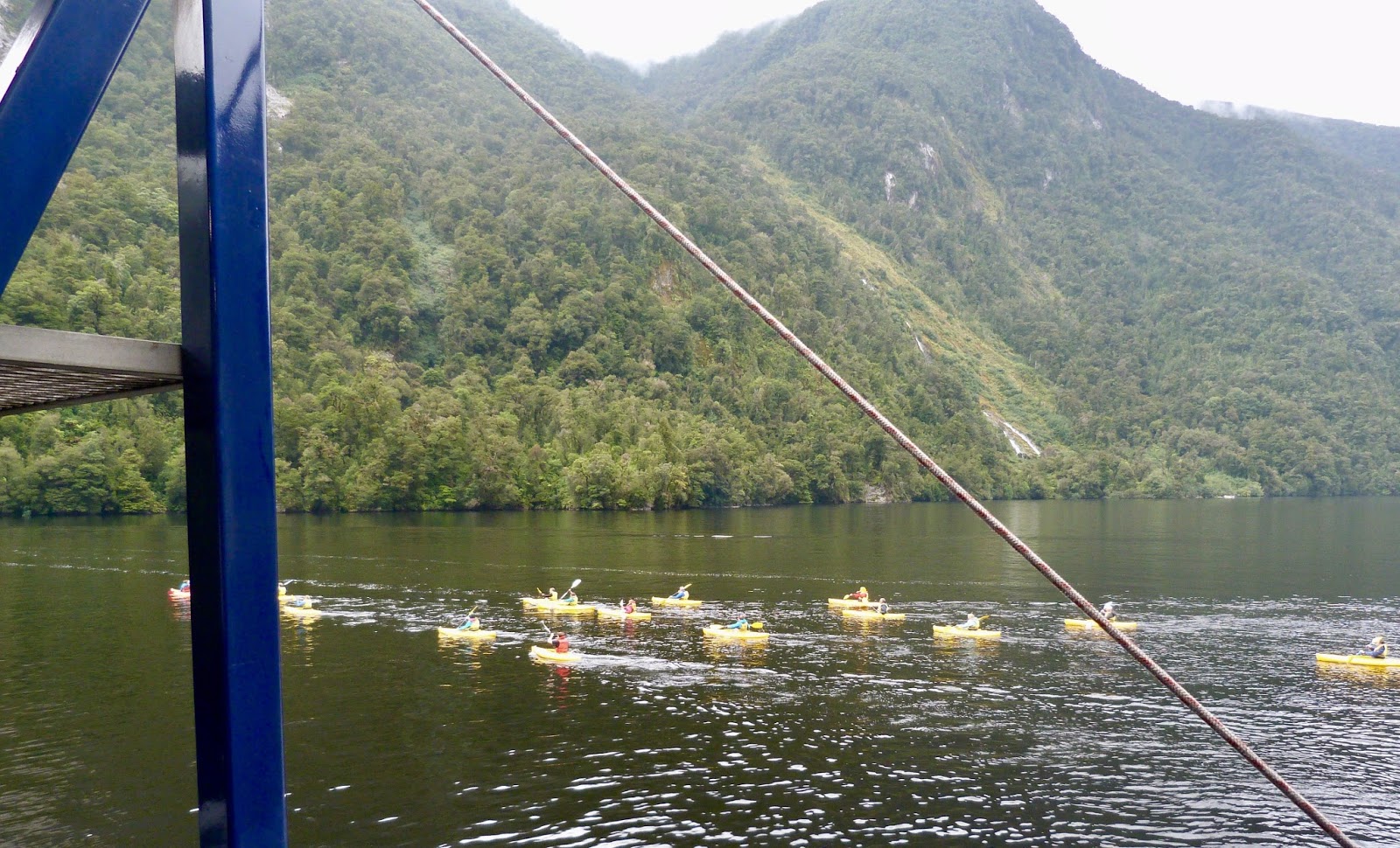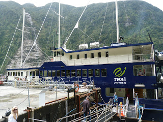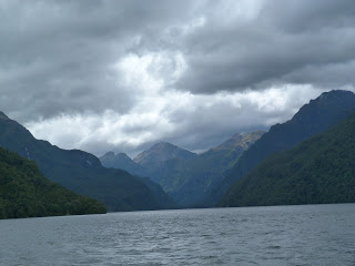 The next morning I took a 30-minute bus ride to Manapouri and then an hour-long boat trip, and then another 30 minute bus ride that would finally take me to the mouth of Doubtful Sound. (If you look at the map at the top, Doubtful Sound is that little squiggle going out to the sea opposite the plane’s propeller.)