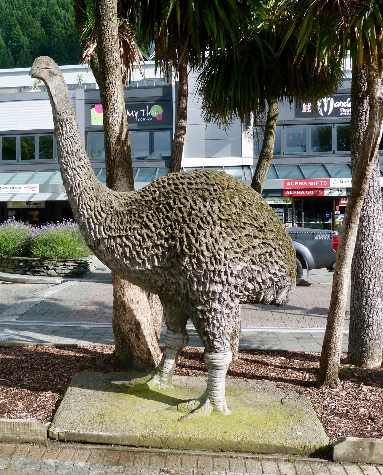 A view of Queenstown from the lake and a life-size Moa bird statue in the park. Unfortunately, the Maori found them good eating and they are now extinct.