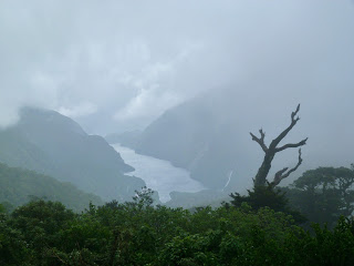 Doubtful Sound flowing out to the sea as seen through the mist on the bus ride to the ship.