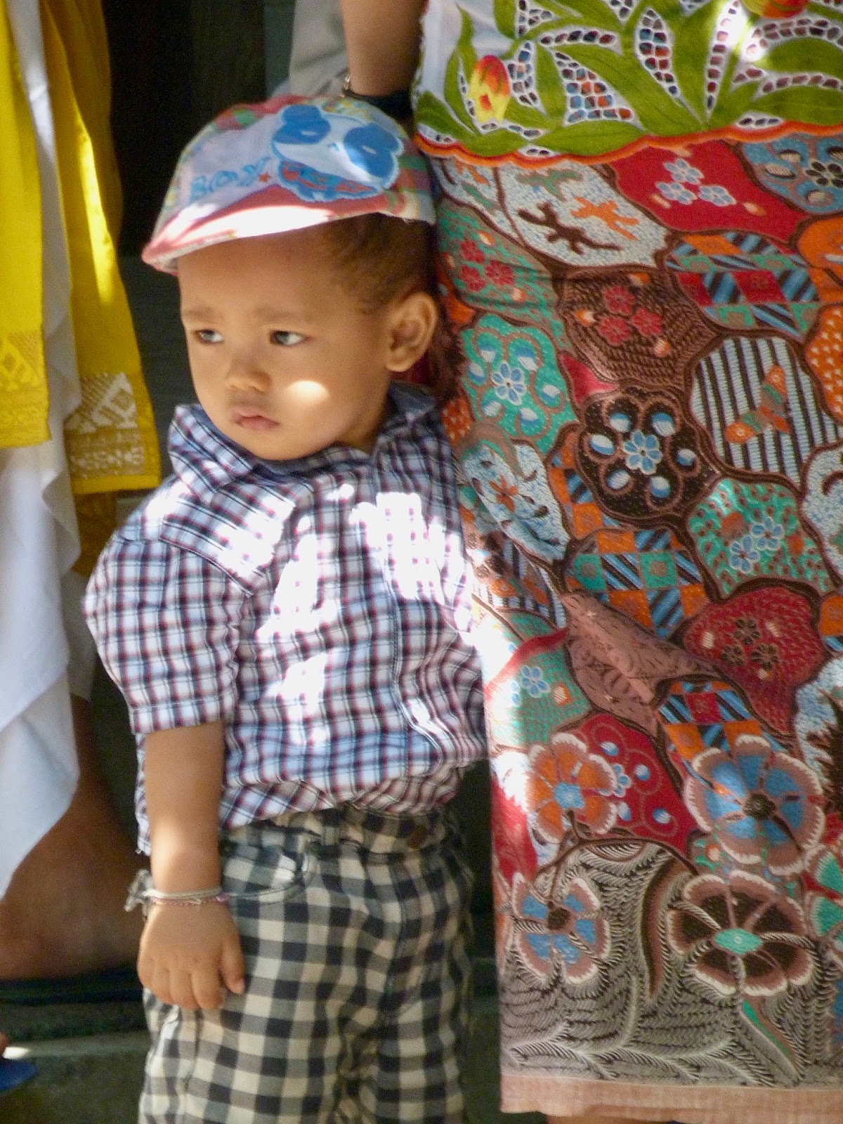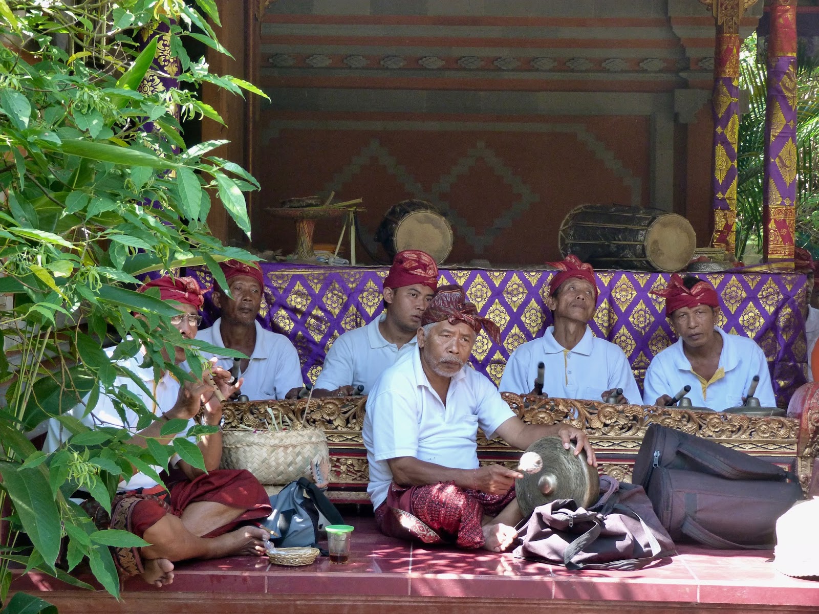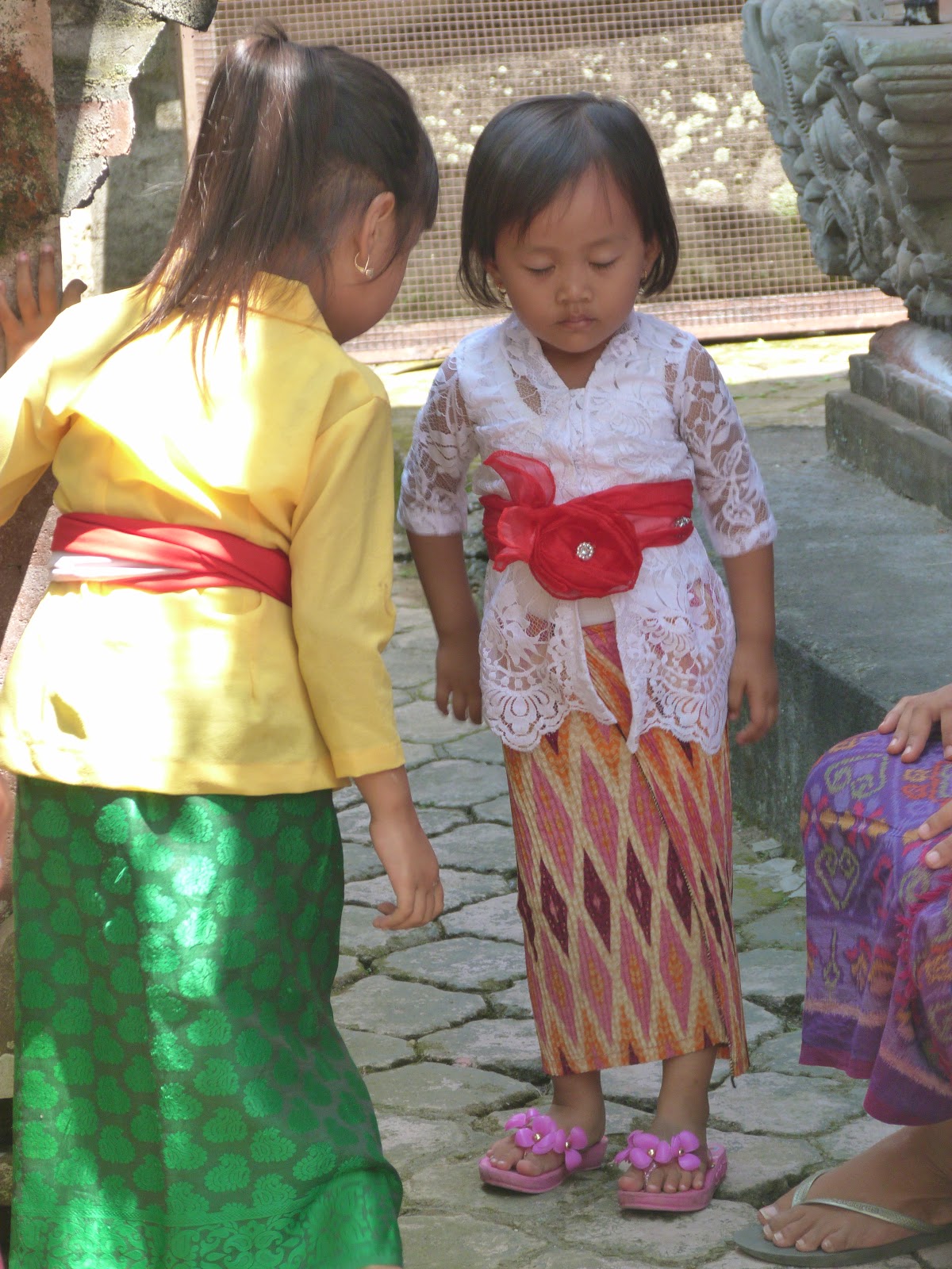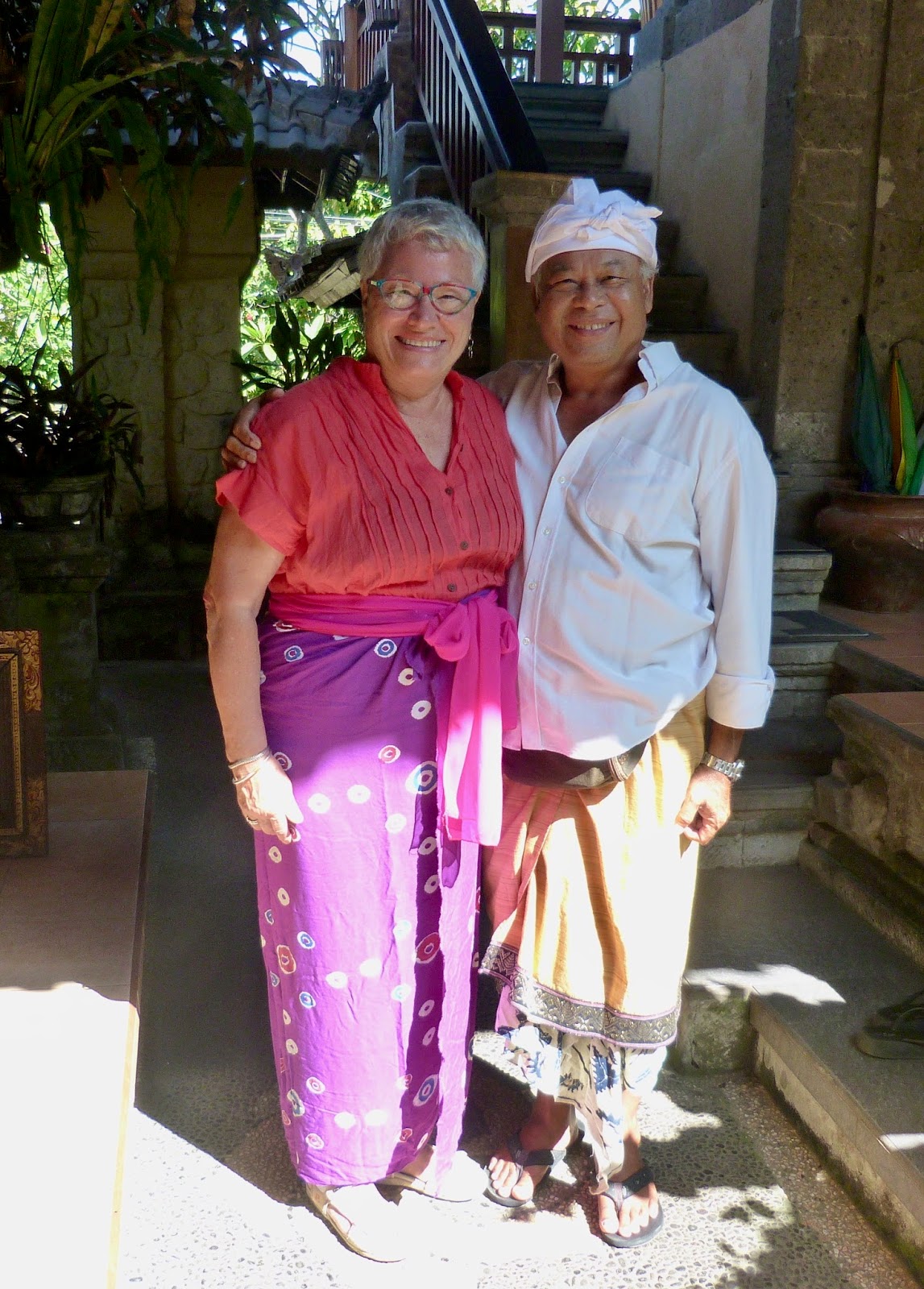 Men wear a folded white fabric hat, white dress shirt and a darker, muted-colored sarong.  The point of their sarong is always much longer at the front and even drags on the ground.  Darta shared with me that the men do not wear underwear!  In their heat, I could understand why.  My sarong was tied over my pants and within minutes  I so wanted to be able to take them off