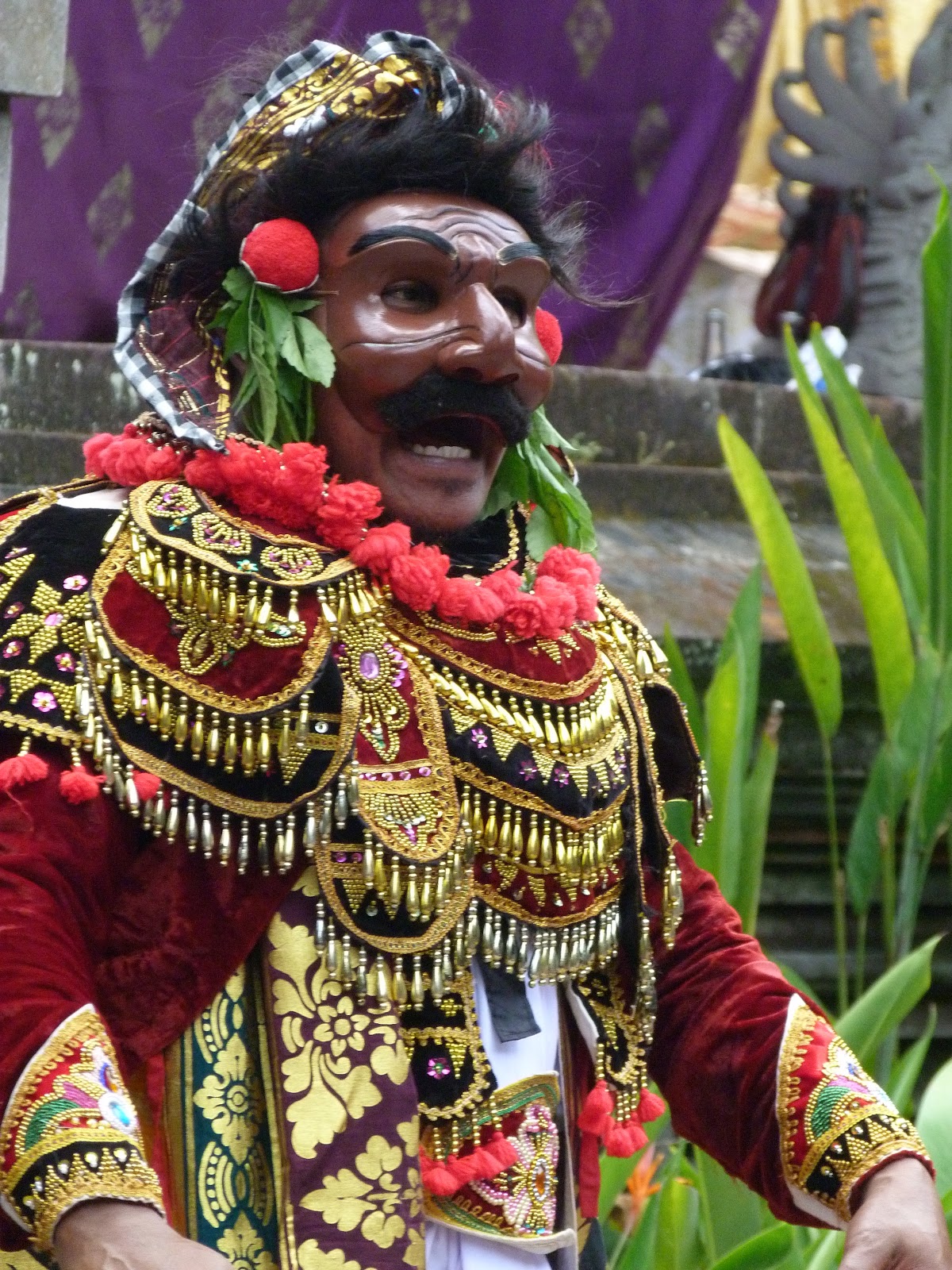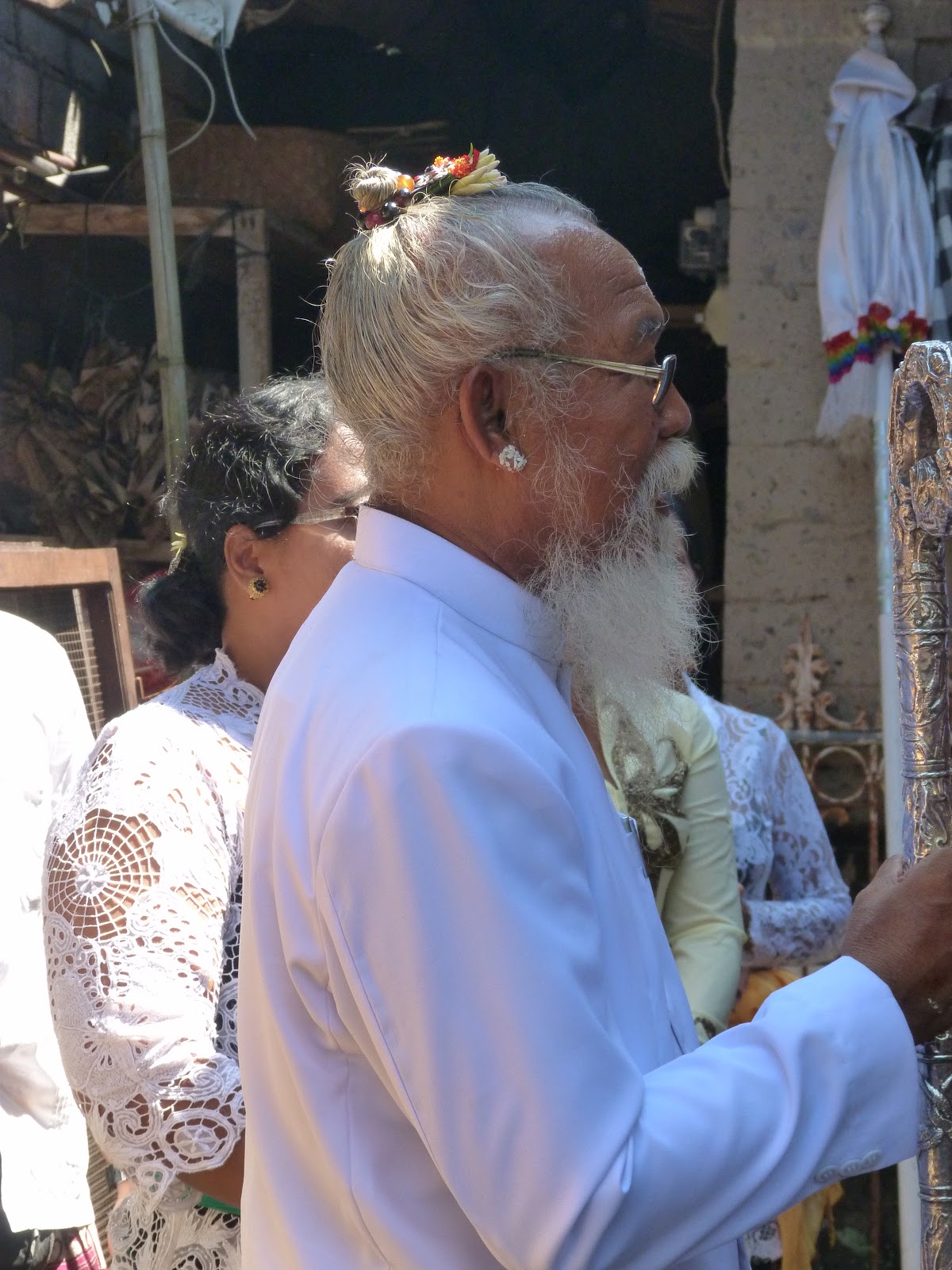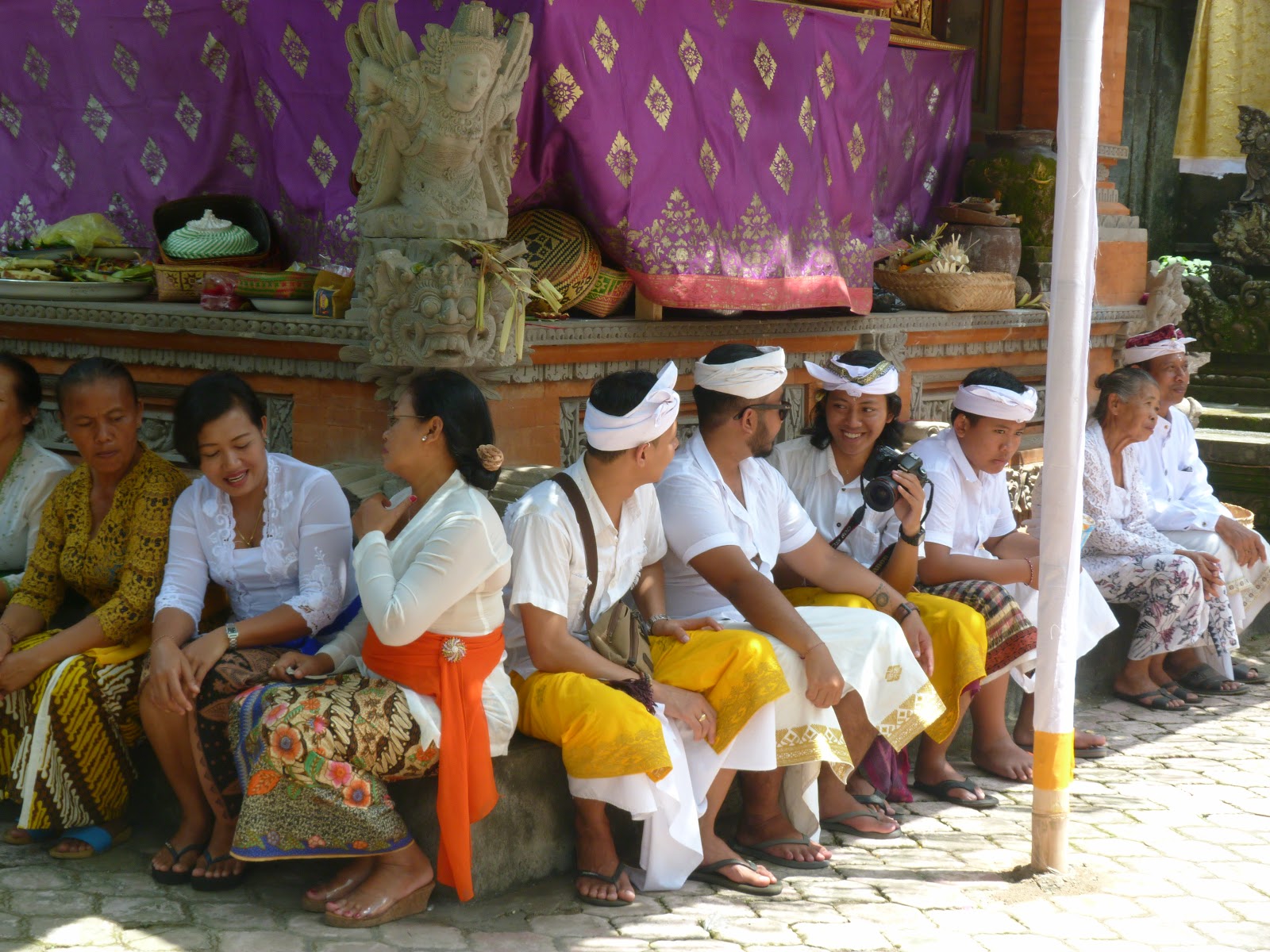 It is necessary for women to dress properly when entering a temple or attending a ceremony.  I was given a traditional sarong, normally of colorful batik cloth, which one of the women tied for me so it would not fall off and then a scarf is tied around the middle.  Women normally wear a white kebaya, or blouse, but I did not have one so my shirt, because it had a small sleeve, was passable. You will see from the photos that the women’s kebayas can be extravagant, very sheer, lacy, colorful and are worn with a corset underneath.