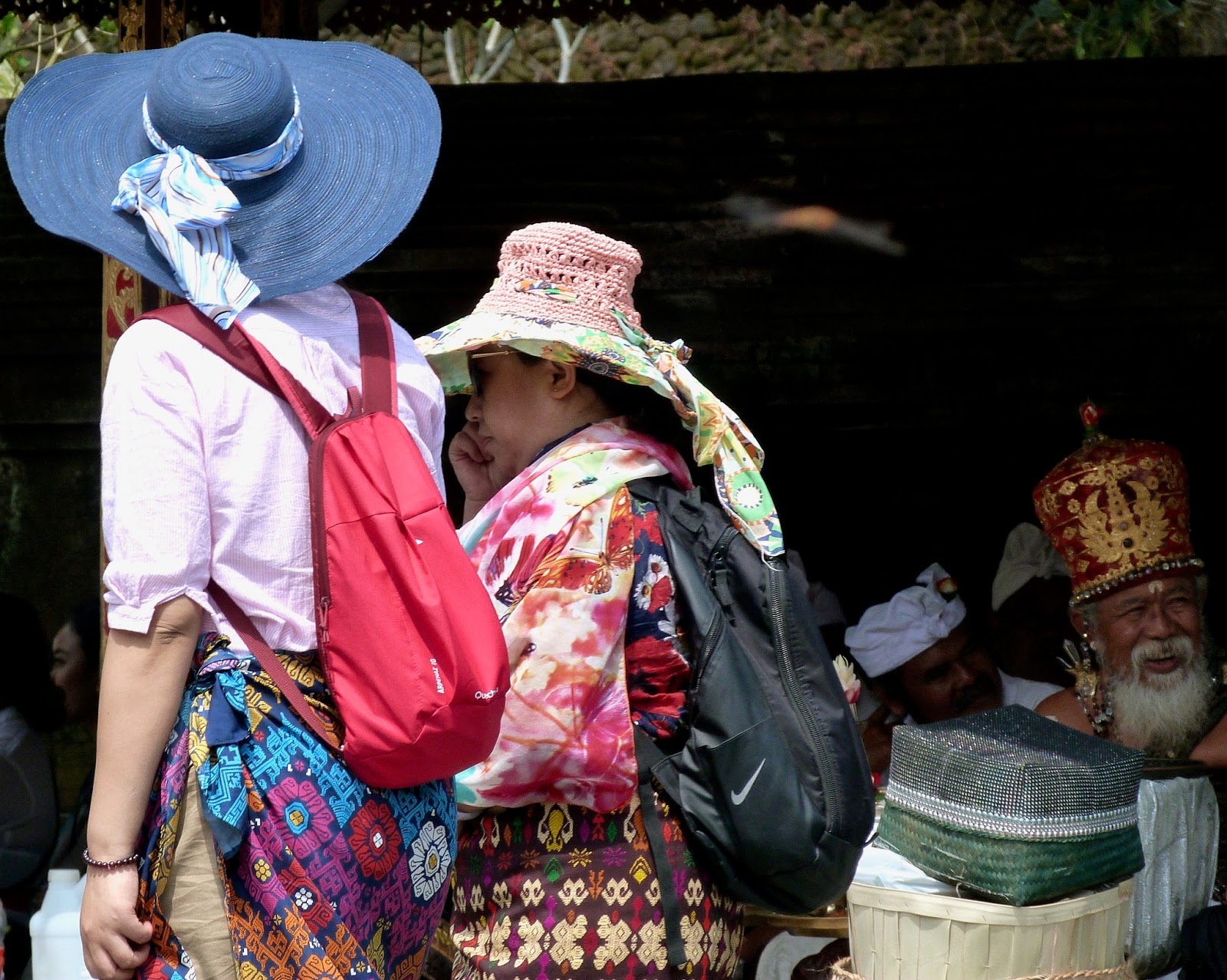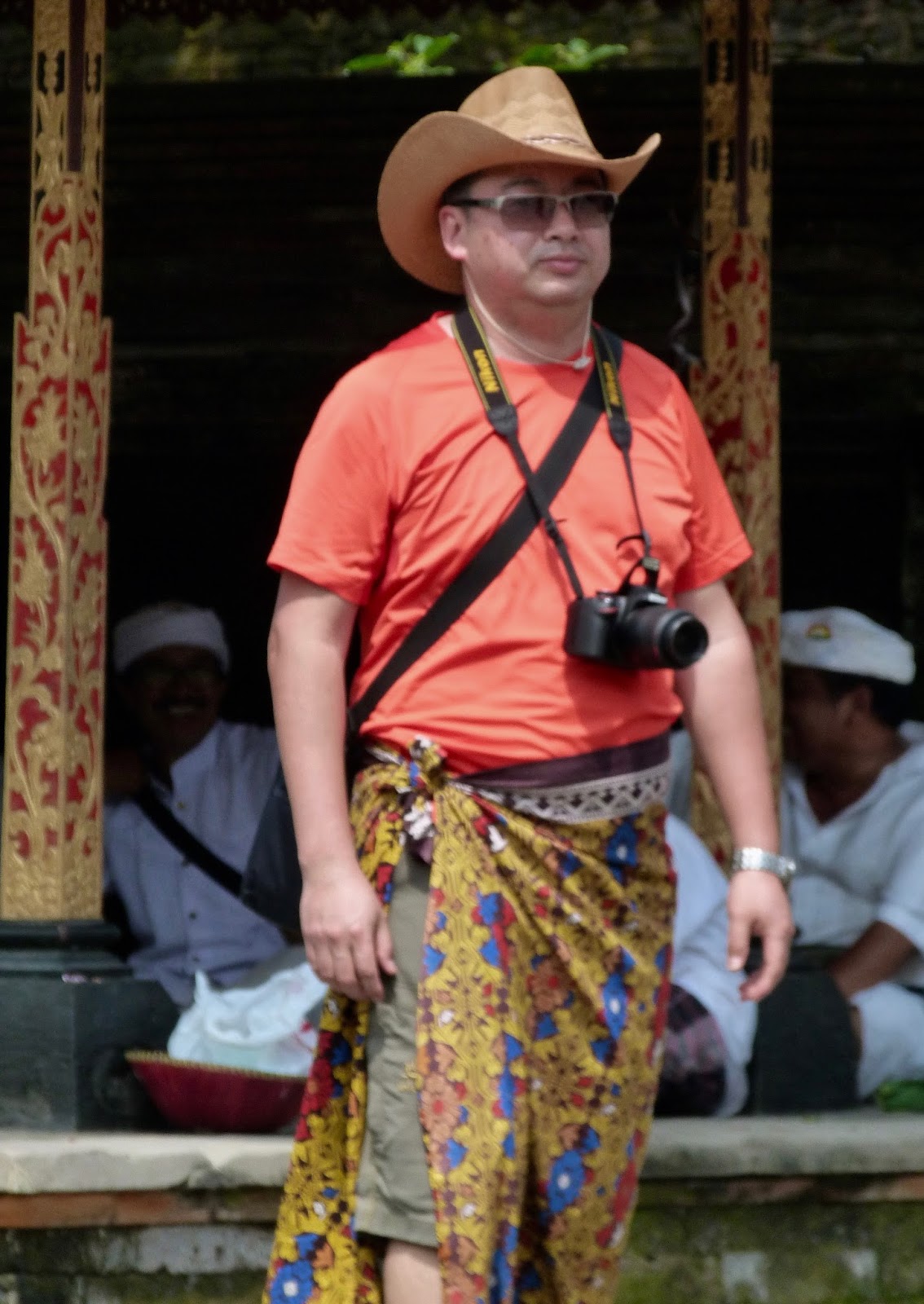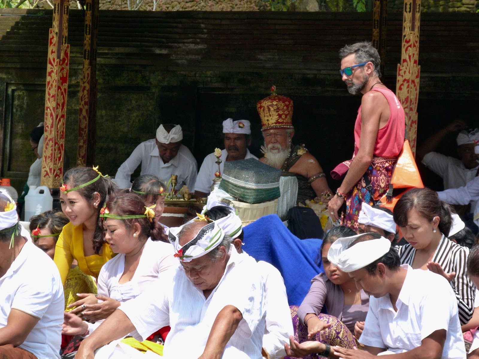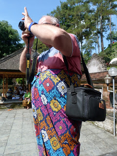 This Temple requires that all that enter must wear a sarong. I had my trusty purple one which was ‘mine’ to use at all ceremonies I attended during my stay. But tourists who come to the temple are provided with a sarong to wear upon entry (for a small donation). While Darta and family were being showered and praying, I spent my time observing, taking photos are getting the giggles seeing some of the amazing outfits that ‘tourists’ ware!