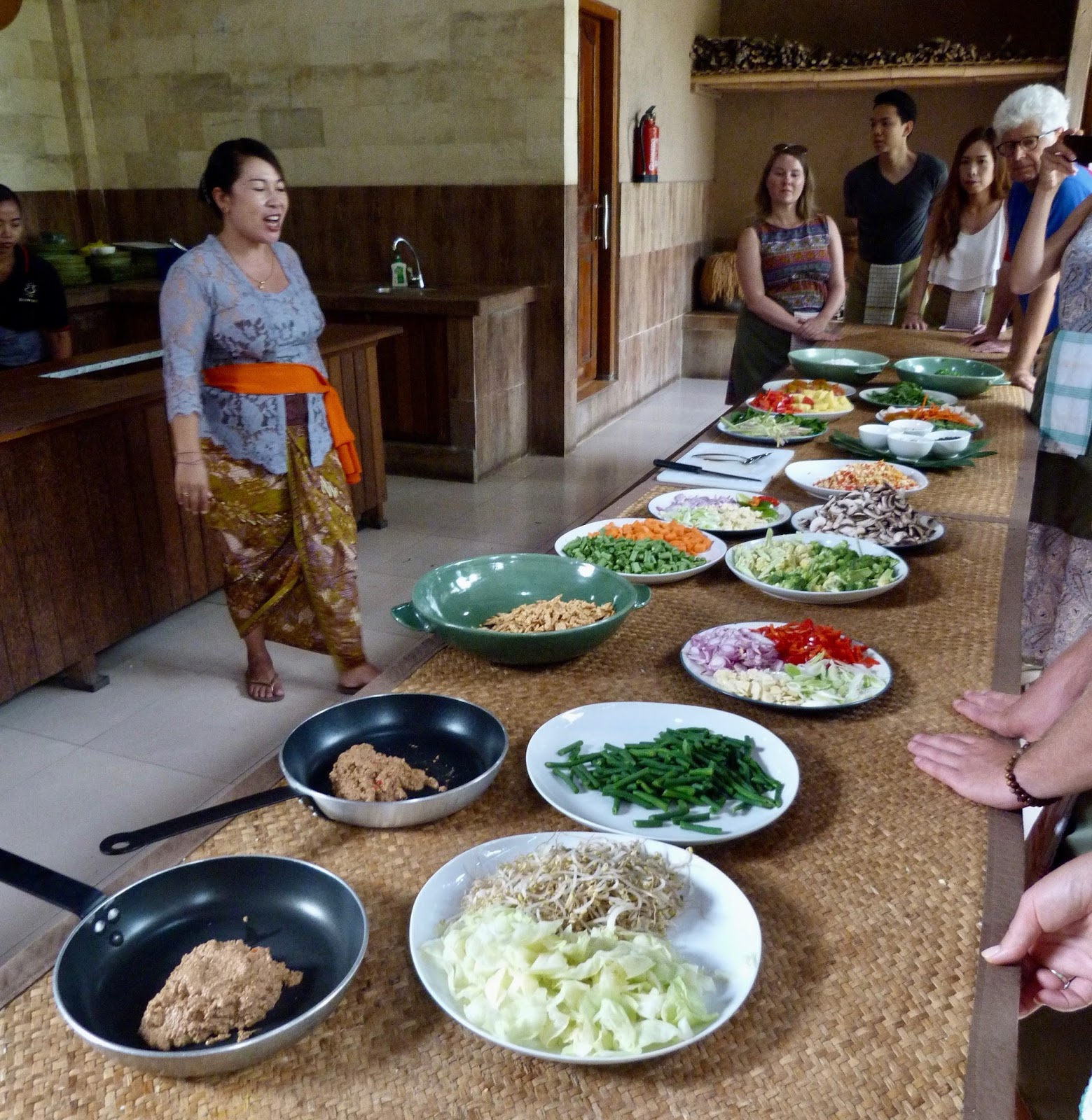 Our hostess and chef, Puspa, for many had been the head chef in several of the island’s top restaurants before building a large industrial kitchen on the backside of the family home.  It is here that she and her husband  and a staff of helpers welcome groups of 15-20 for 4-hour classes two times each day.