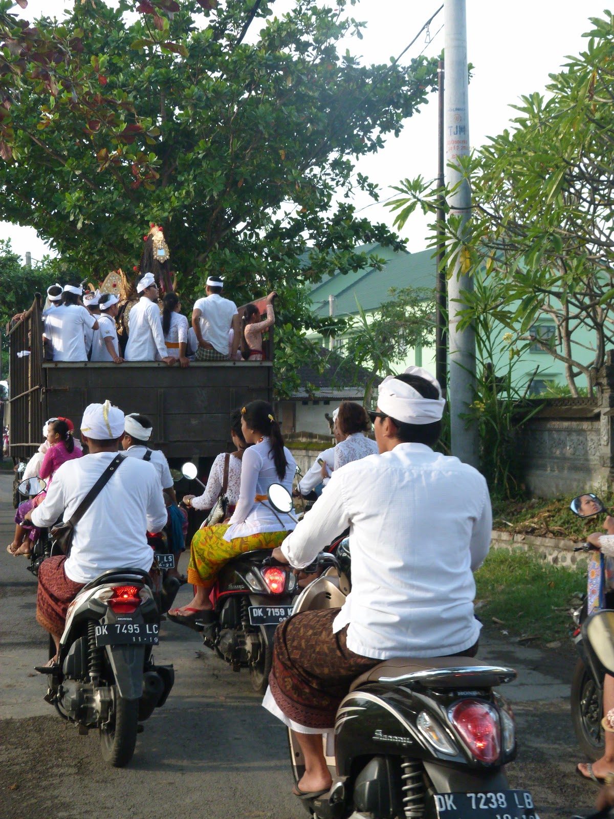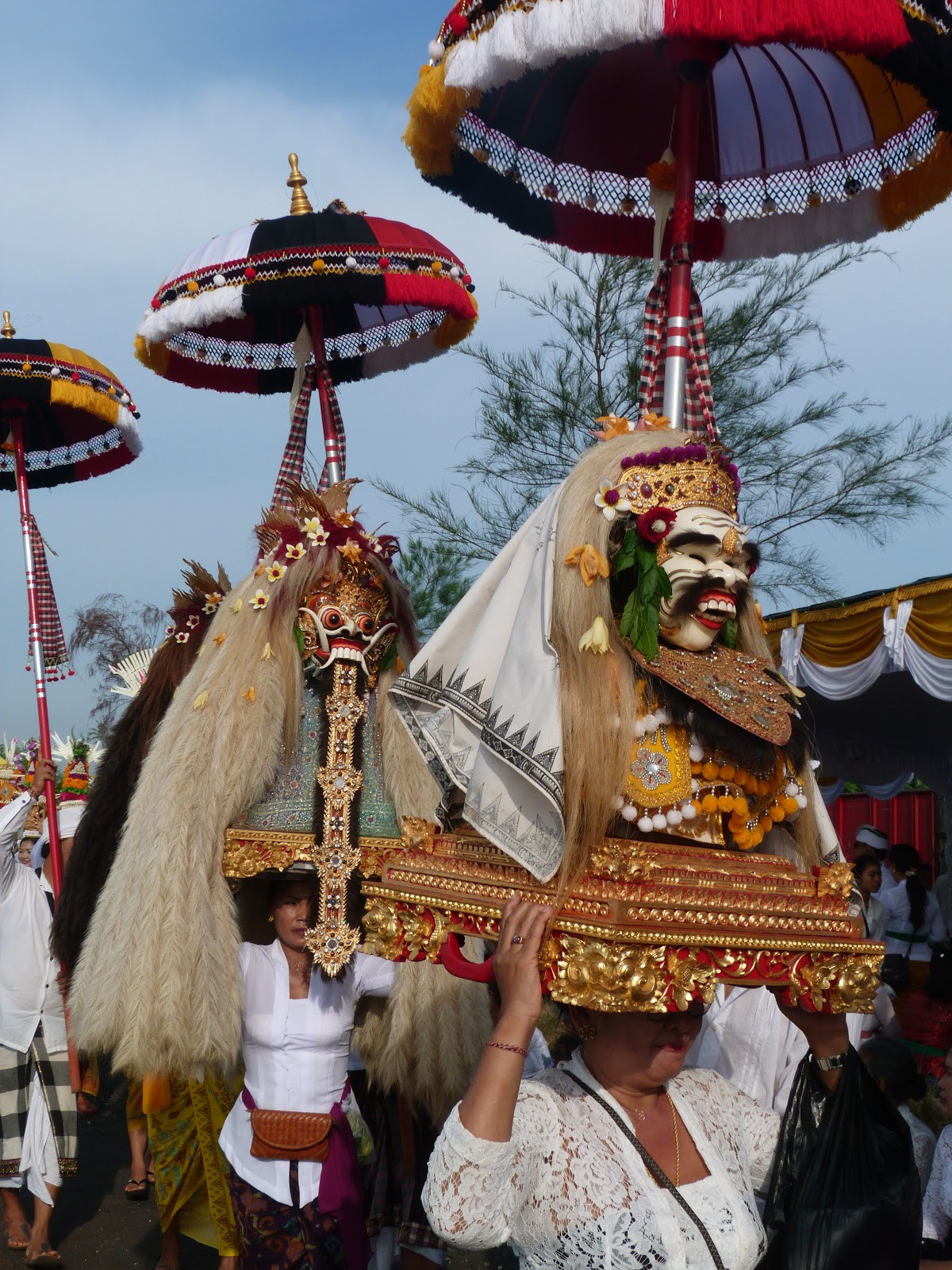 During the month I was in Bali, there were not an inordinate amount of festivals – probably just 15!  It seemed that every day these gentle people were celebrating something or giving praise to another of their Hindu deities.  I was invited once again by my host and his family to attend a celebration, this time held on the beach, which was a blessing for their ‘suburb’ of Ubud.  They flocked to the seaside in the truck-loads and scooters by the dozens.  They got dressed-up for the celebration, making even bigger offerings to their God.  The same priest officiated (this was the 3rd ceremony I had seen him officiate).  He was one busy man!
