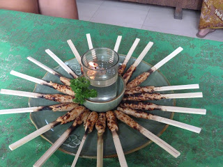 And yes, we actually did the cooking – with the assistance of Puspa’s kitchen helpers!  We ground the spices in a large lava mortar with a huge wooden pestle. Made curry paste (Hot!)  We chopped lots of vegggies. We make small meatballs and cooked them in coconut oil.  We wrapped a shrimp mixture in palm leaves to steam and made skewers of chicken sate’.
