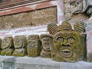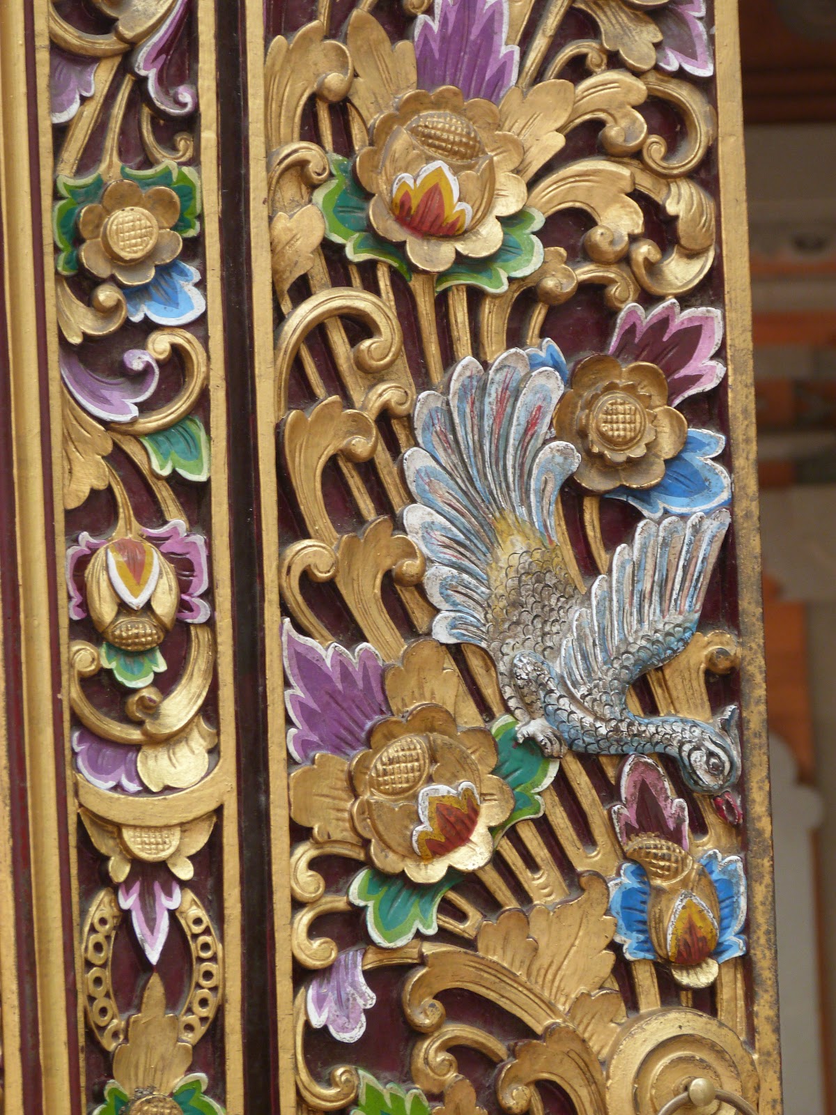 Weird stone faces and serene and very green rice paddies were part of my daily scene.  I loved the intricately carved and painted doors and large displays of plastic pink chickens adorning the entryway into this lovely home.  I’m guessing it’s Bali’s answer to our ‘pink flamingo-ing’ a yard for birthdays or graduations.