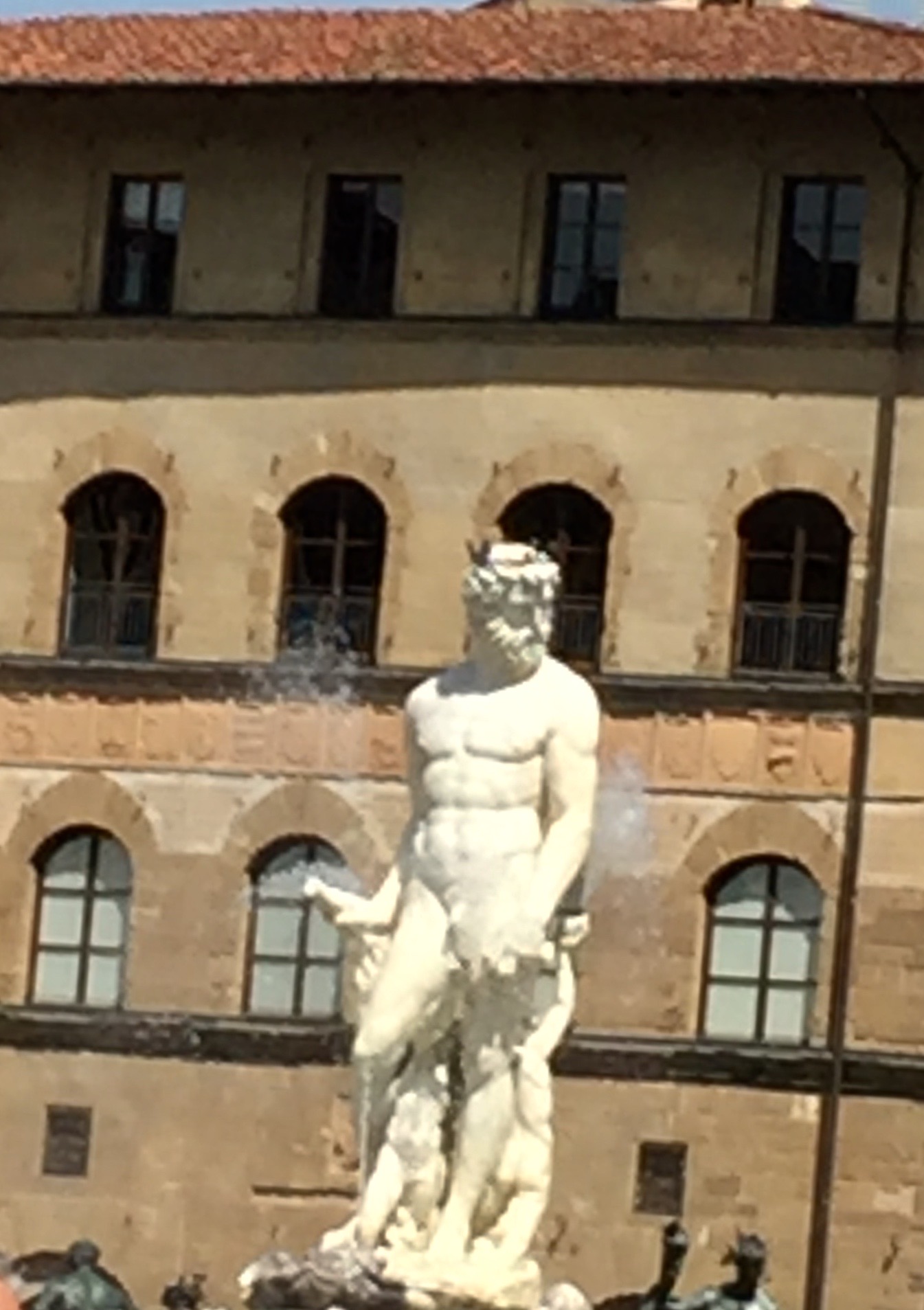But what made this tour outstanding was we got to see a whole bunch of the city. We walked by the Pitti Palace, through the quiet streets of Oltrarno, the Plaza Saint Spirito, strolled across the Ponte Vecchio and into Palazzo Vecchio where one of the five David’s resides – along with Neptune spouting water from all sides. Joyce was photographed trying to be a scooter babe. We went into a few big churches and found Pinocchio everywhere. You do know he was an Italian puppet who became a ‘real boy’ in the city of Firenze? We fell in love with people-watching, those special touches, a pair of very expensive Ferragamo shoes, the reliefs on the buildings, the street lamps but especially….
