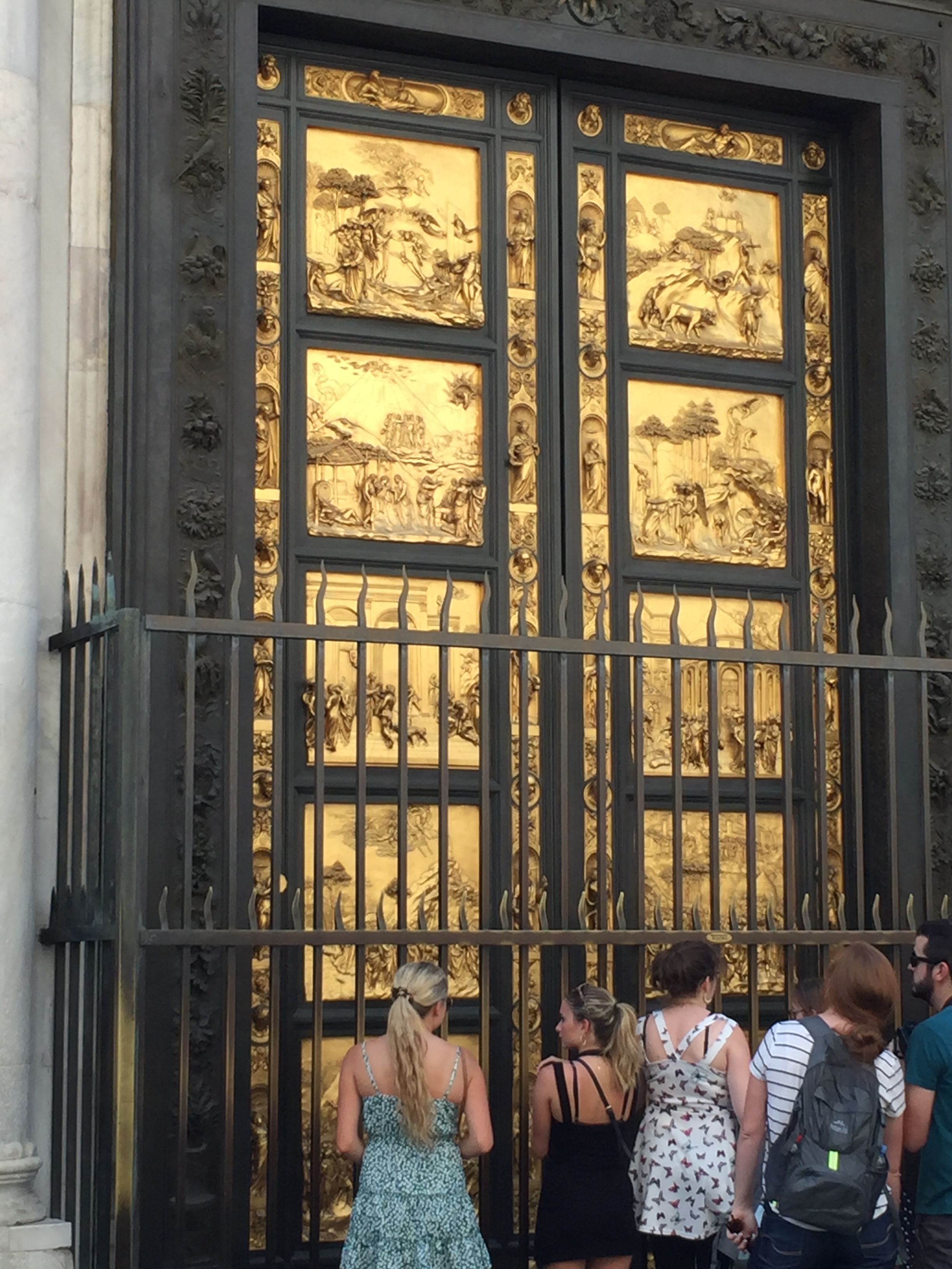Our Airbnb location turned out to be great! We were within a few minutes walk of the Duomo! This is Firenze’s main cathedral which was begun in 1296 and completed in 1436. Need I point out that this was 56 years before Columbus discovered the Americas! Europe has a way of showing those of us from the US just what a young a country we really are! And, this was the first time we encountered a mass of tourists. These pictures don’t show the sea of people that filled this square waiting to tour and climb the hundreds of stairs to the top of the Duomo.