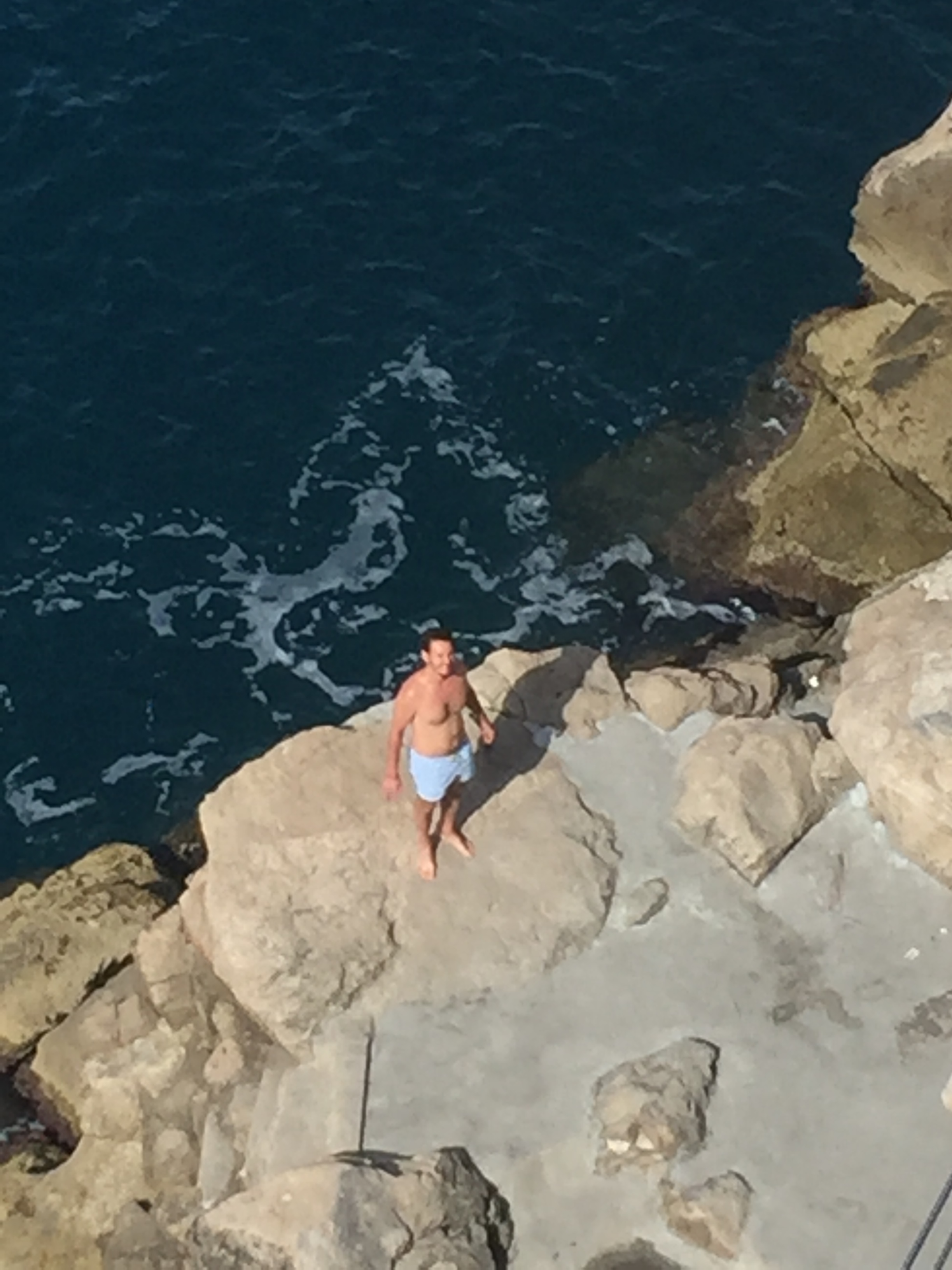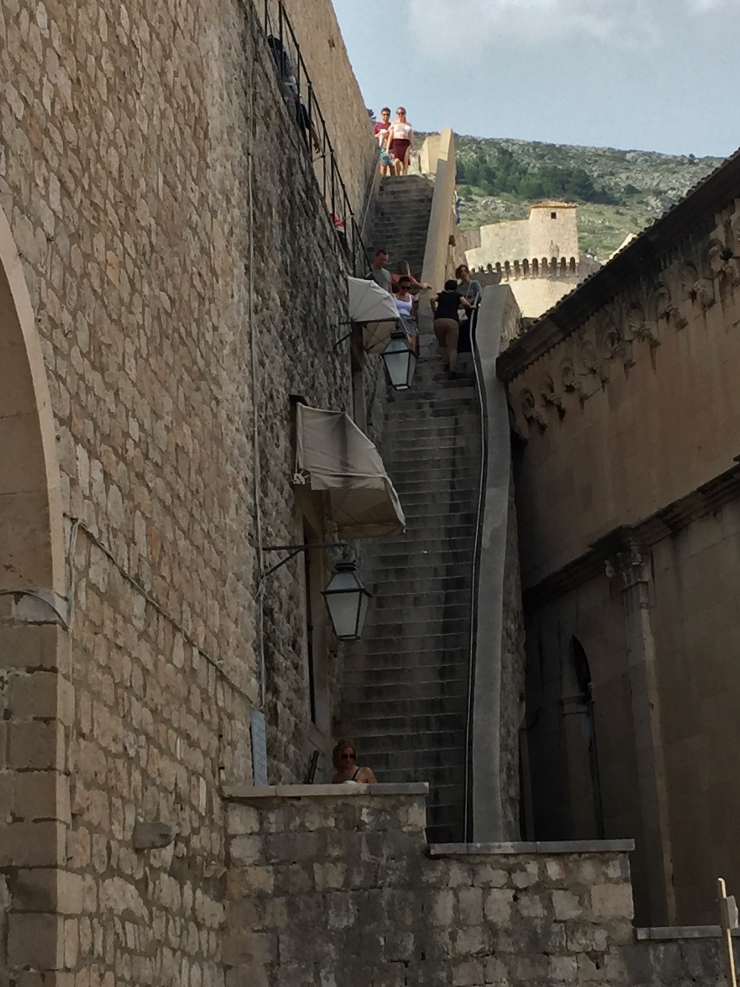The next morning, to avoid the crowds, we got to town at 8:30 a.m. to walk the walls that circle the Old Town. The temps have been brutal so an early tromp up 800+ steps and a 1 -1/2 hour walk to circumvent the town was a true test of the energy we two ‘old broads’ can endure! Take a good luck at the first photo of just the first flight of stairs we had to climb to get to the top of the wall to begin the walk! And, yes, we did enjoy the young man doing his daily yoga routine on the rocks far below!
