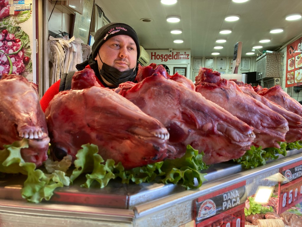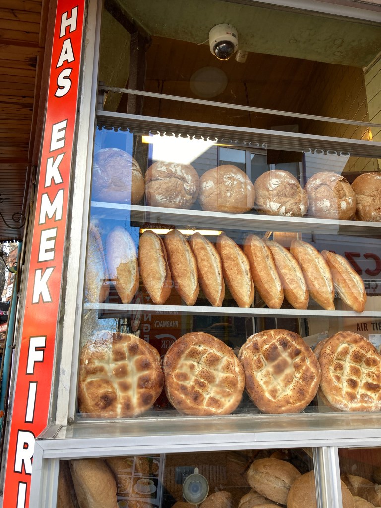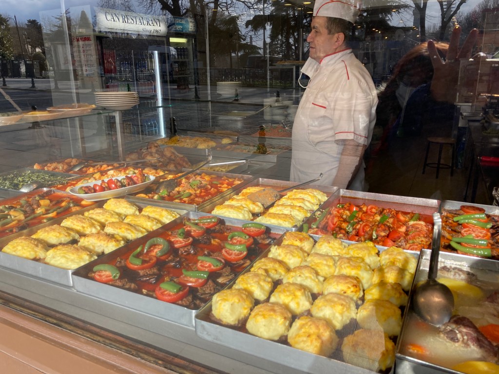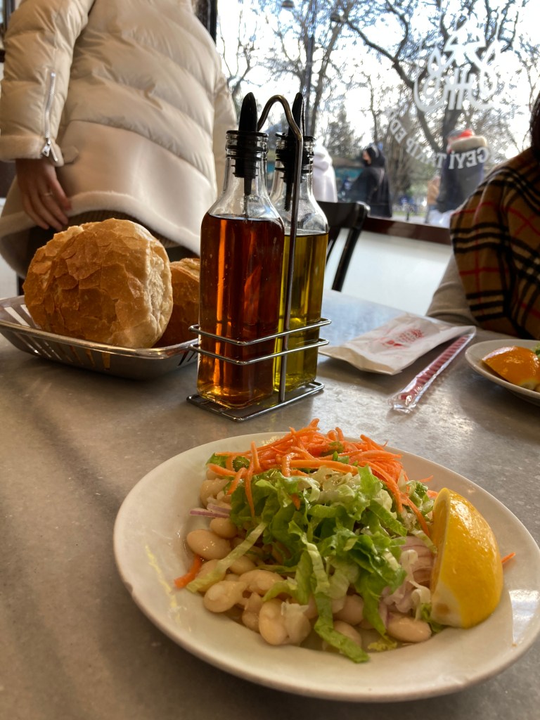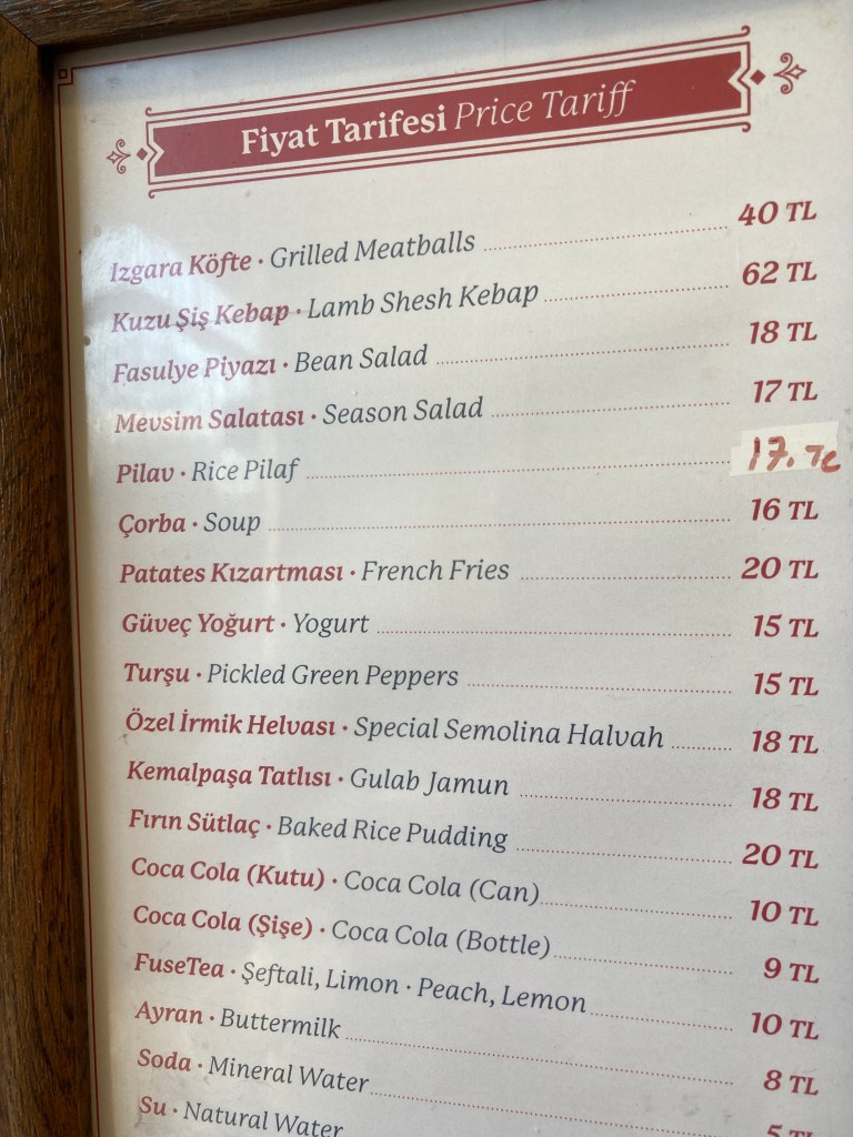 We dined at ‘the original restaurant’ to make these traditional, rectangular, yummy meatballs made from a combination of lamb and pork. Served with a large roll that was crisp on the outside but doughy on the inside, you broke one in half, pulled out the doughy part and stuffed one or two or three meatballs inside, and slathered them with sauce. OMG! The ‘side’ was a white bean salad topped with carrot and lettuce and fresh-squeed lemon juice. The price of this lunch, with a Coca-Cola, was 68 Lira or $5.01. Worth every single penny!
