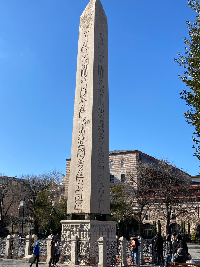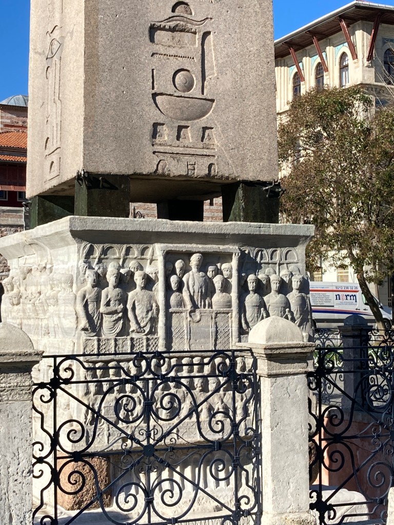 After our short stay at the Blue Mosque, we walked nearby to the area known as the Hippodrome of Constantinople. This was a public arena mainly for chariot races. It was also home to gladiatorial games, official ceremonies, celebrations, protests, torture of convicts, and had a seating capacity of 40,000. The Hippodrome functioned in Roman (203-330 CE), Byzantine (330-1453 CE), and Ottoman (1453-1922) periods. Today it is a public square known as Sultanahmet Square. It remains the same dimensions as the original Hippodrome. (1,476 ft) long and 427 ft wide.)
