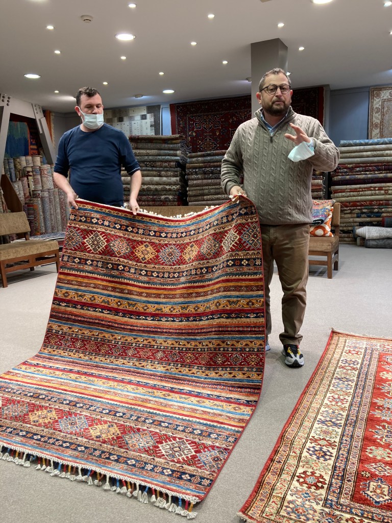 Next, we are off to look/shop for real Turkish carpets. Everyone asked me when I got home if I had purchased one and the answer was no! They were REALLY expensive. I have nothing against expensive as the workmanship is amazing. Each is hand-dyed wool or cotton and woven by a local woman. I loved two smaller ones which the salesman showed me would fit into my ‘free carry-on suitcase’ that came with purchase. I still declined. What was most interesting was depending on the way the carpets were laid and you looked at them, they completely changed their color and ‘glow.’ I hope you can see that from the photos I took.