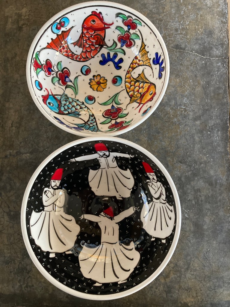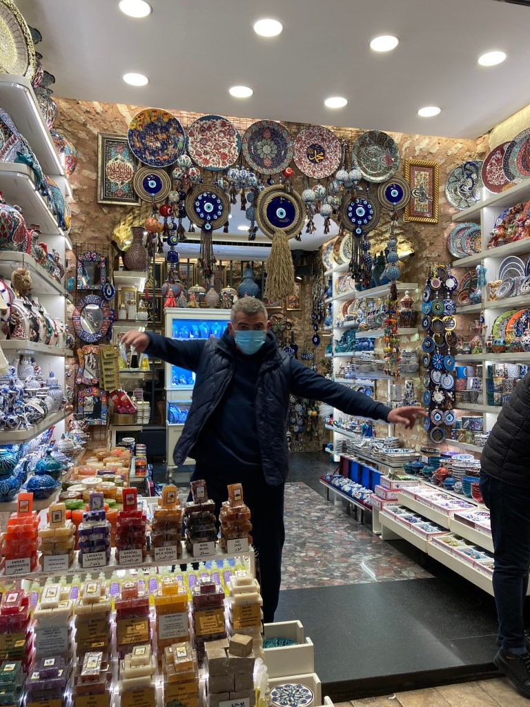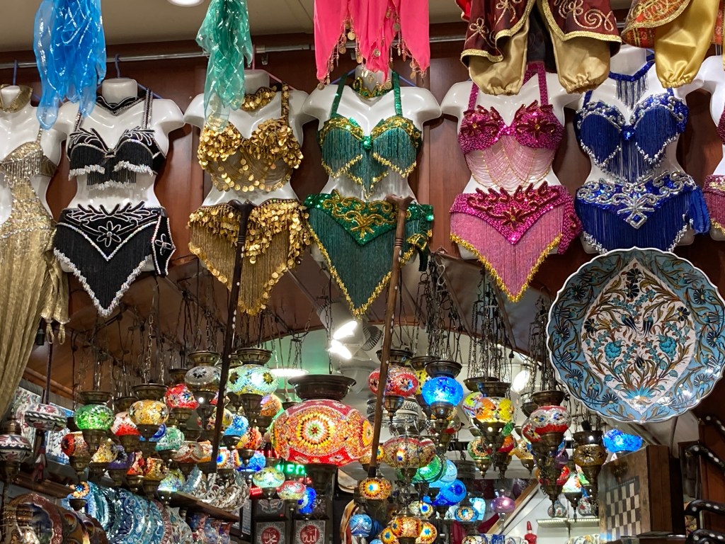 He did – and I walked away with two huge, heavy bags loaded with a variety of over a dozen spices, vacuum-sealed so I could take them through customs. I also did some shopping at a cashmere scarf shop, picked up 2 pottery bowls to remind me of Istanbul, and considered, for a minute, bringing all my girlfriends their favorite color of belly-dancing costume!