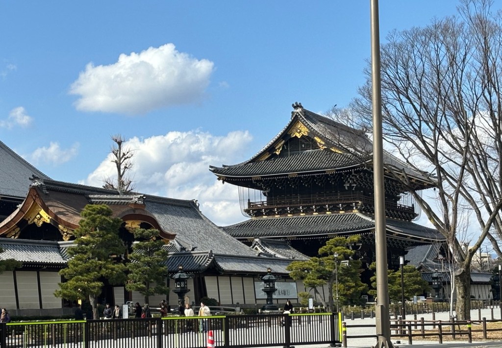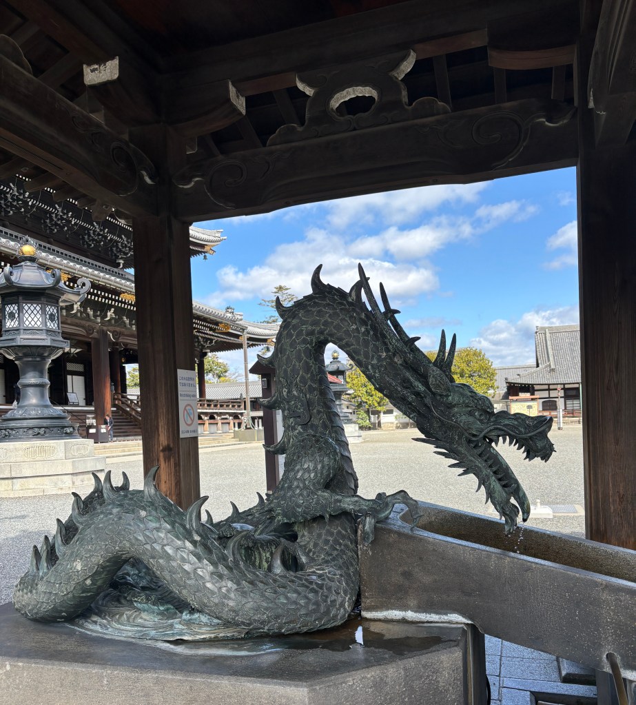 I had a very speedy ride to Kyoto and found that my hotel was within a 10-minute walk from the train station. Flat sidewalks and no cobblestones, easy-peasy! But my mouth fell open as I stopped directly across from the hotel and saw this amazing structure – The Higashi Hongan-ji – or ‘The Eastern Monastery of the Original Vow,’ where the first structure was built on this site in 1602. Welcome to Japan!