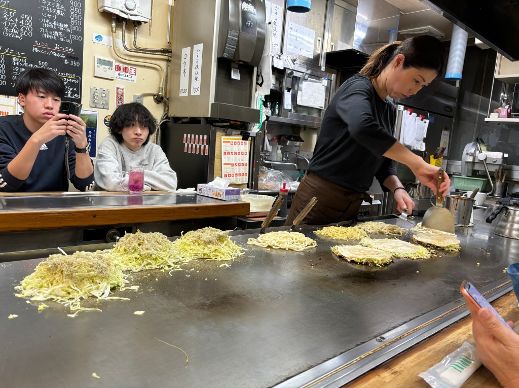 I hadn’t yet reached a decision as to how I could manage to continue to travel with this group. We were basically tied together – the same itinerary, the same hotels for the next 2 1/2 weeks while in Japan. Phyllis found me sitting on my bench and persuaded me to join the others for a lunch of Hiroshima okonomiyaki – a specialty she assured us we could not miss trying – one she had loved from her childhood visits here.
