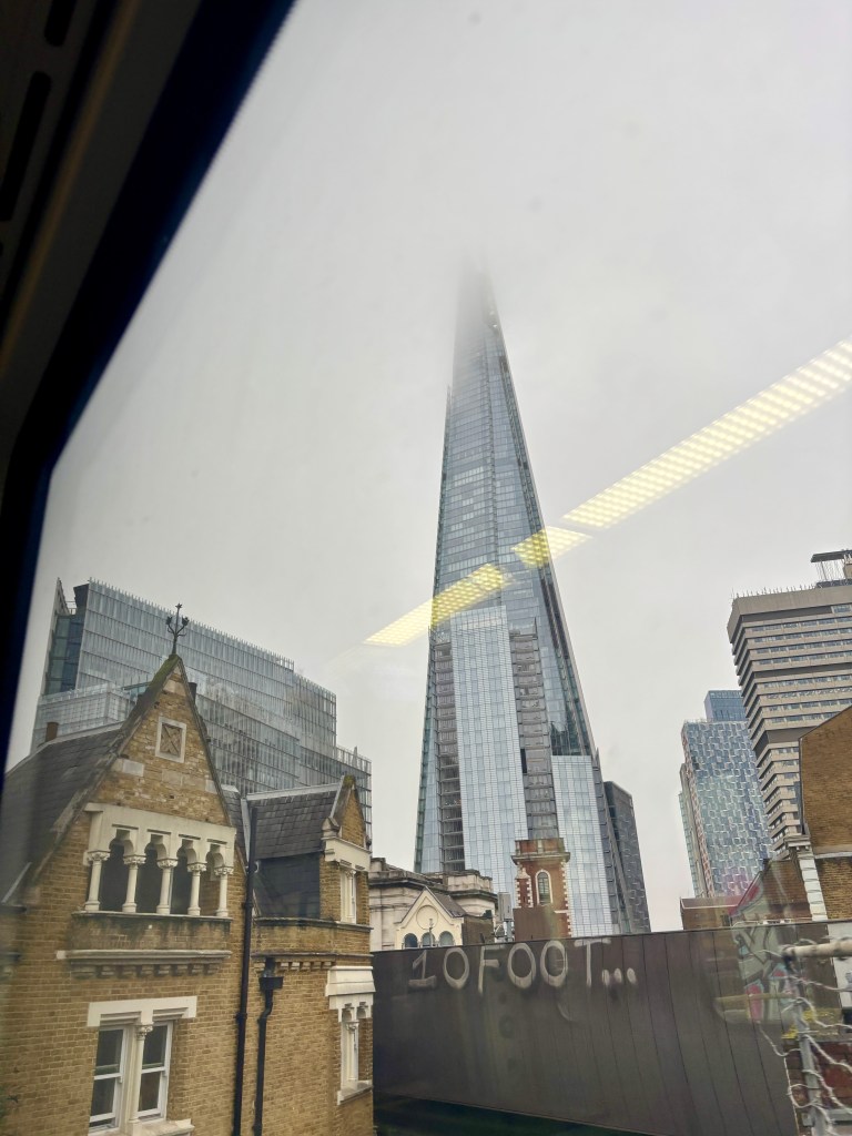 A few asides. If you have ever taken a train in the UK, they announce over and over when boarding to ‘mind the gap’, which means don’t get your foot caught in the gap between the train and the track. Well…..when I tried to hoist my too-heavy suitcase into the train carriage, my foot went into the gap, and I banged it up pretty badly – enough to need several band-aids (which I had in my backpack) and give me a huge bruise that lasted for weeks but was thankfully, not too painful. And I got to see The Shard on my way from Brighton into London – one of my favorite architectural wonders – though the top was hidden in fog.