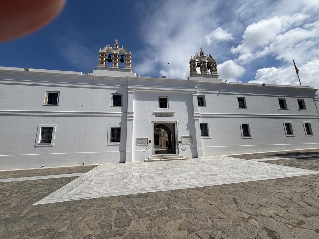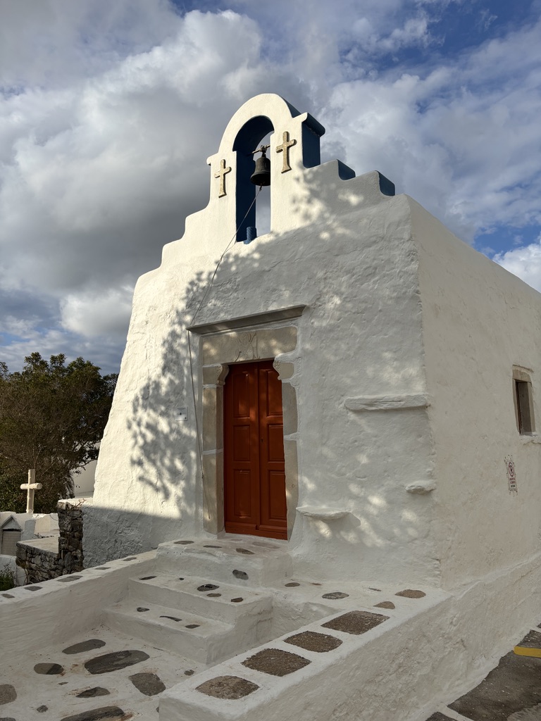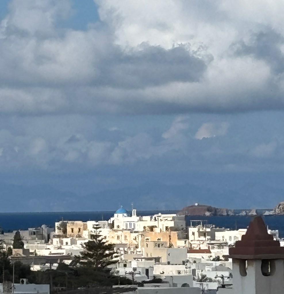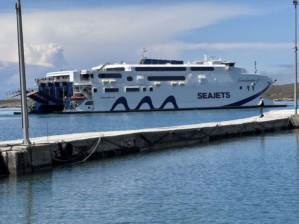 The next morning it was time to board the SeaJet to take me on a 3 1/2 hour ride on a bumpy sea to the island of Paros. But this large catamaran with its huge stabilizers that ferries not only passengers, but cargo, cars, and big trucks, made the journey delightful. Though rainy and cloudy while passing by the Santorini lighthouse, when we arrived in Paros, the sun had once again made its appearance.