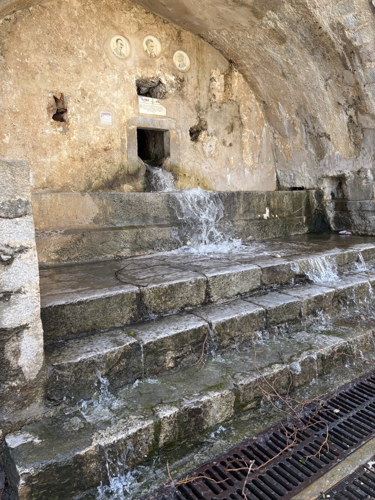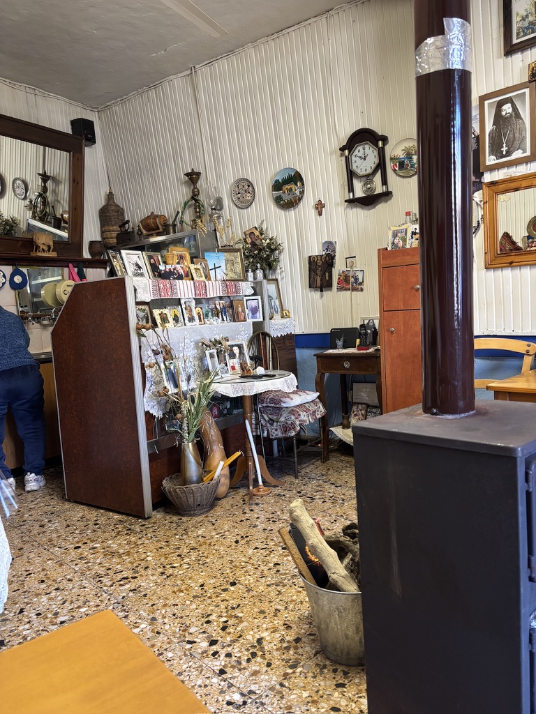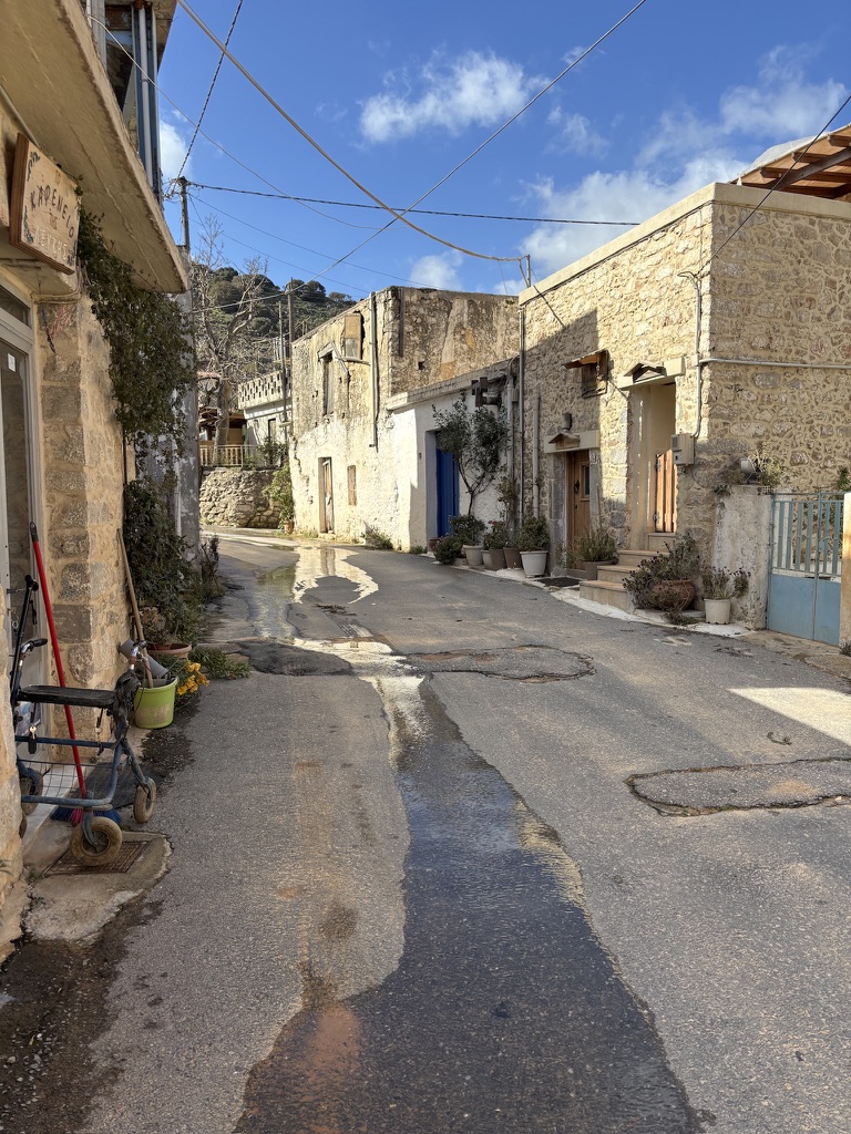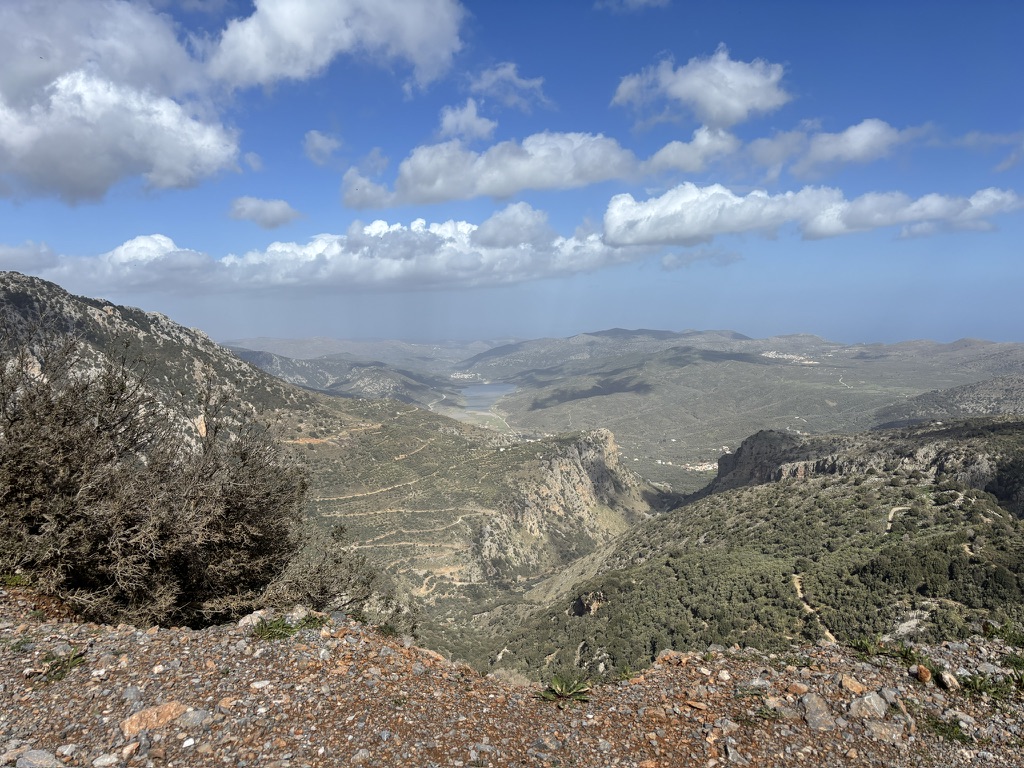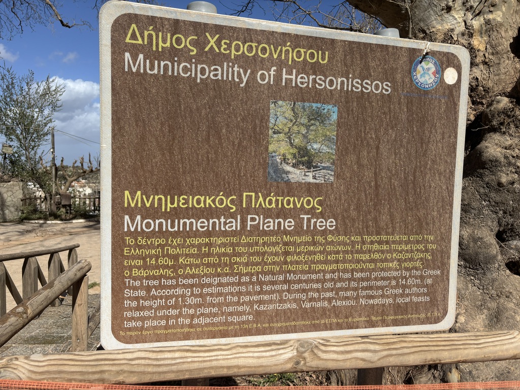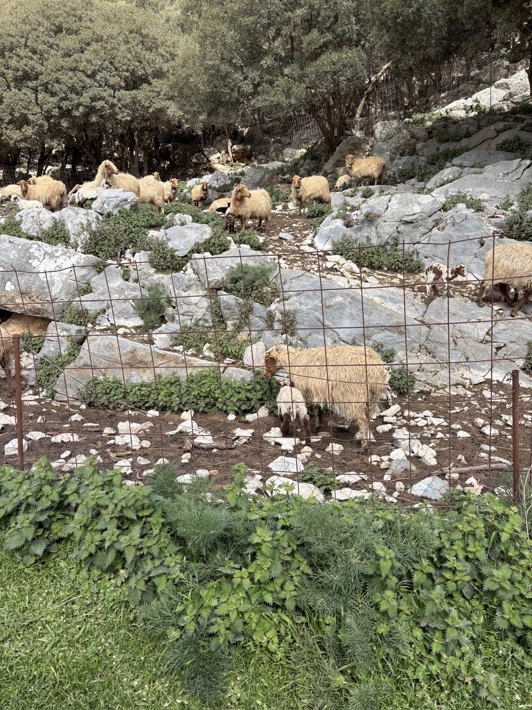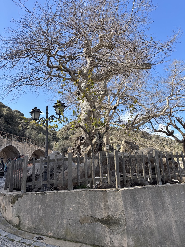 The higher we went, the more beautiful the view became. We stopped at a tinie-tiny village coffee shop for real Greek coffee, and I got a lesson on the traditional headpiece the men still wear during formal and festive occasions. This little village was also home to one of the oldest trees still standing in Crete. Water from the mountains still flows into the public baths used by the villagers to do their laundry. It wasn’t until after WWII that electrcity became available in the mountains, and washing machines started to appear. (Fact: Crete was occupied by the Nazis, and those who could, fled the cities for the mountain villages where the Resistance was in full force.)