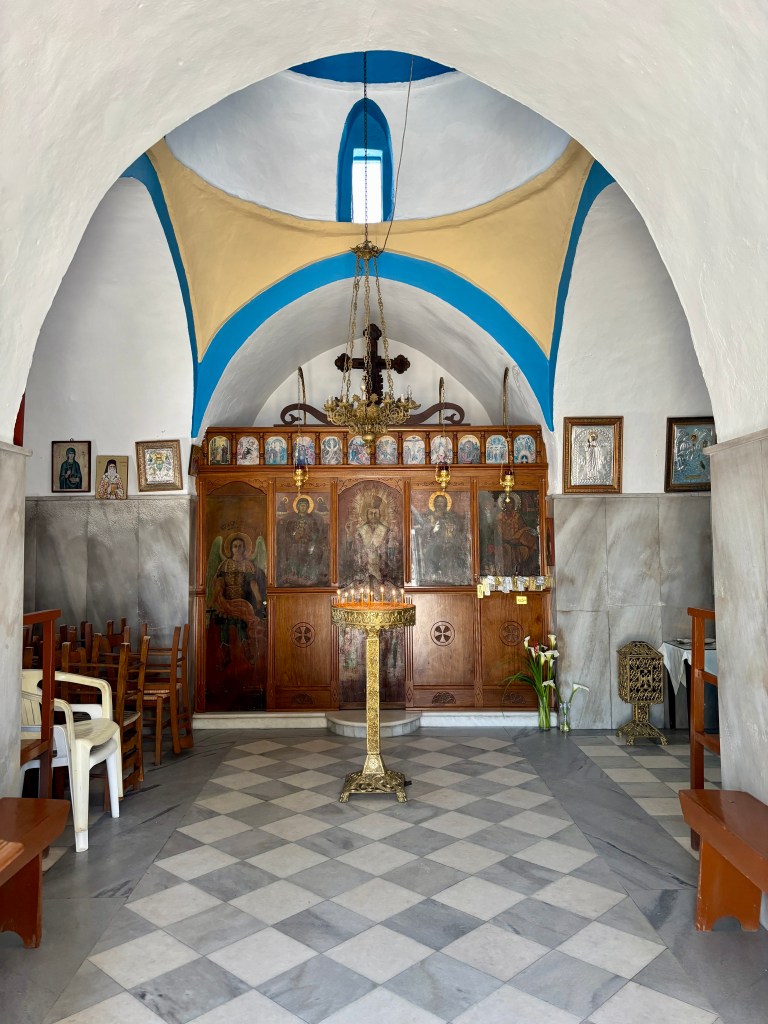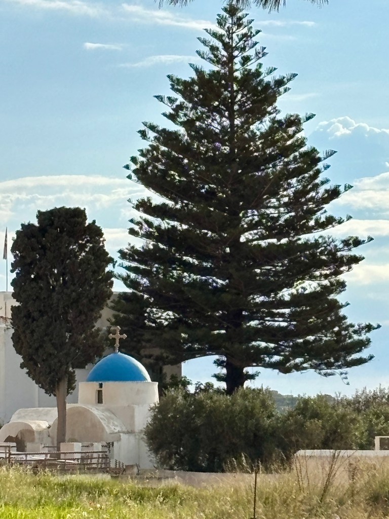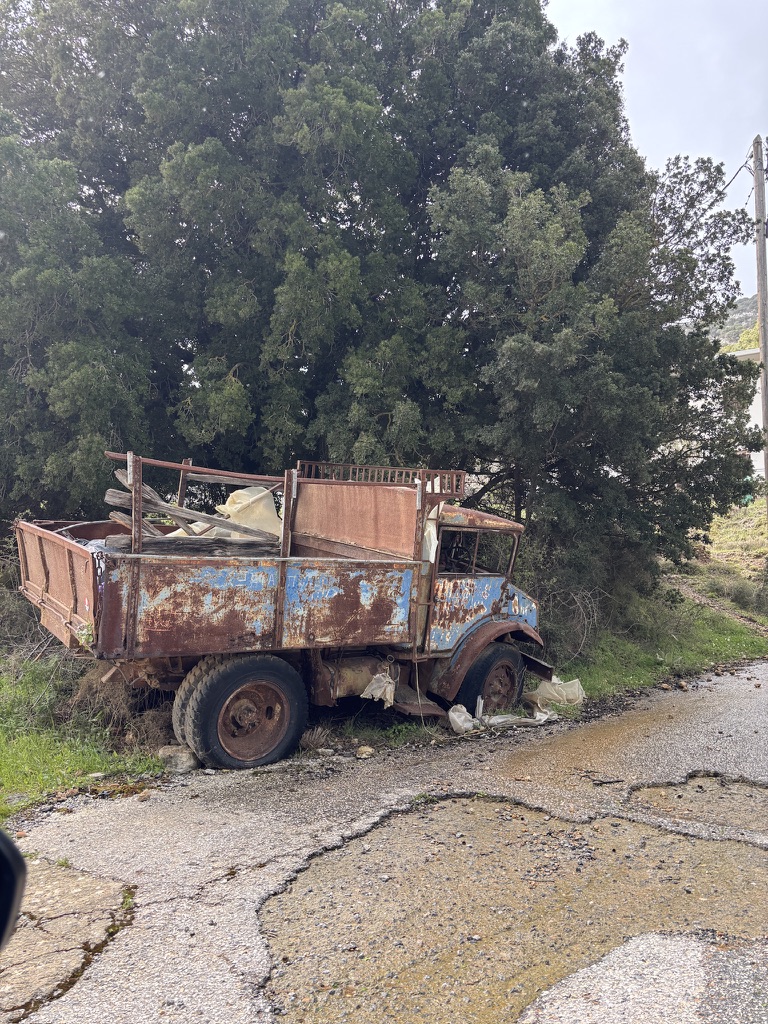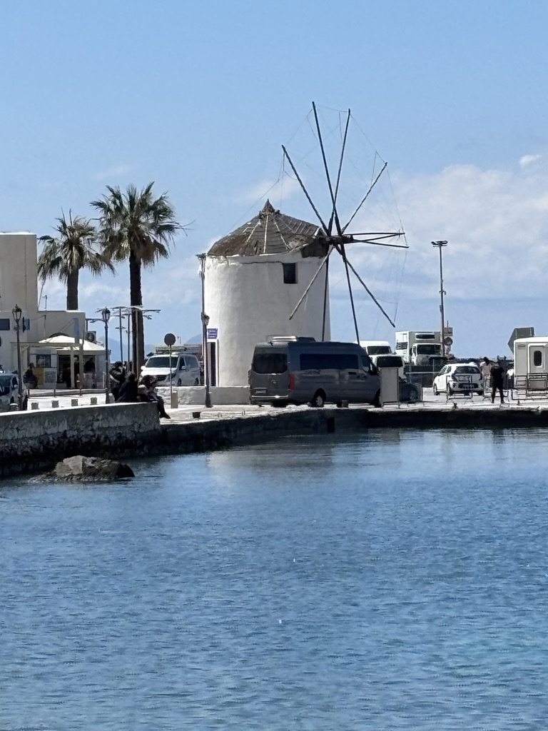 It is a perfect, flat area for farming and raising sheep. It’s famous for its white-sailed windmills and being the birthplace of Zeus. We even saw a rusted-out truck left over from WWII.