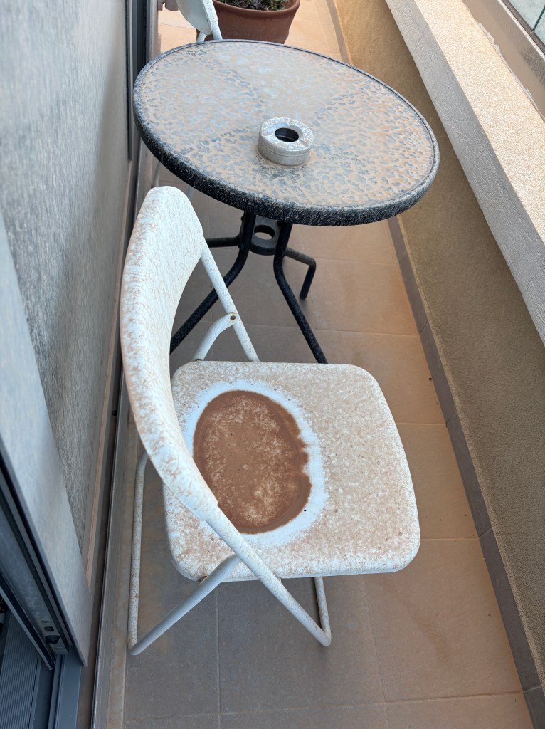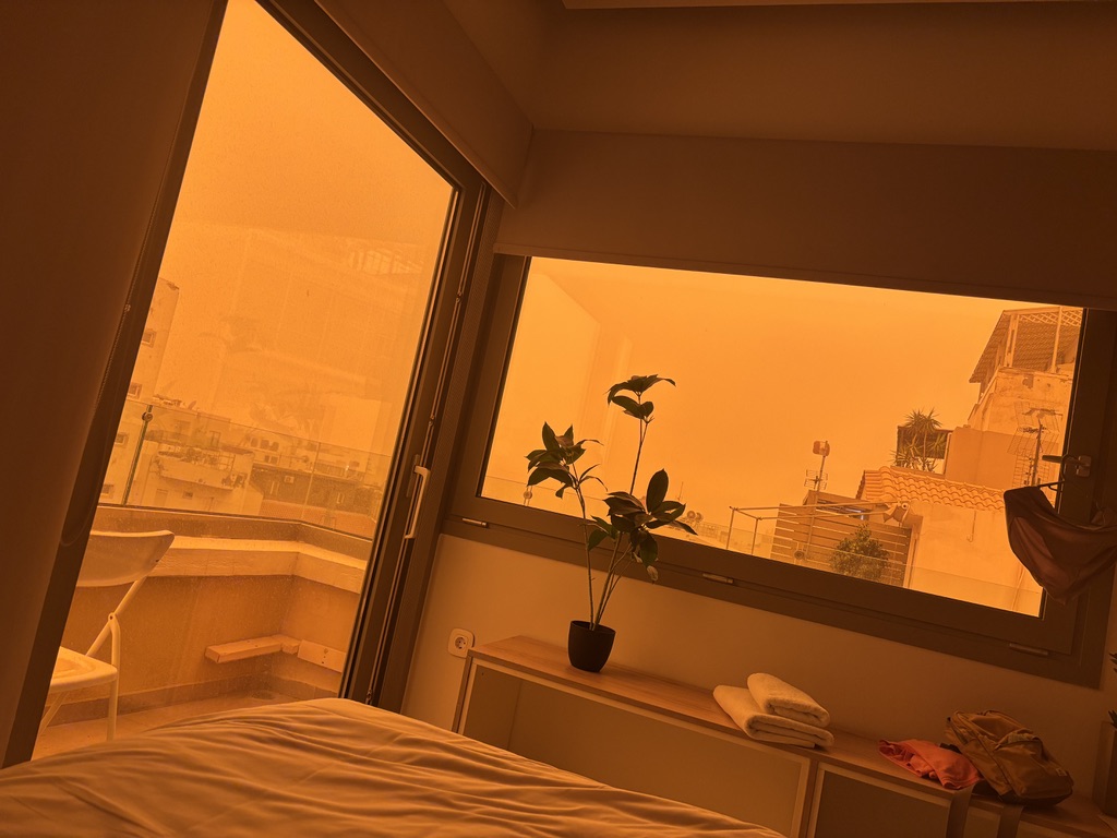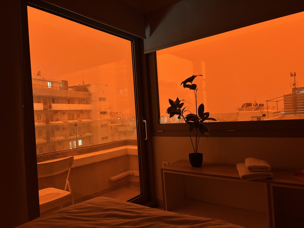 Africa is right below Crete, and these storms are is not an unusual occurrence. But if you don’t know what it is, and all of a sudden your world is orange, it is terribly disorienting and weird! Because it was also raining like crazy, the red dust turned to a red mud that covered everything. The windows, the cars, the streets. Everyone was out power-washing everything for days after this event.